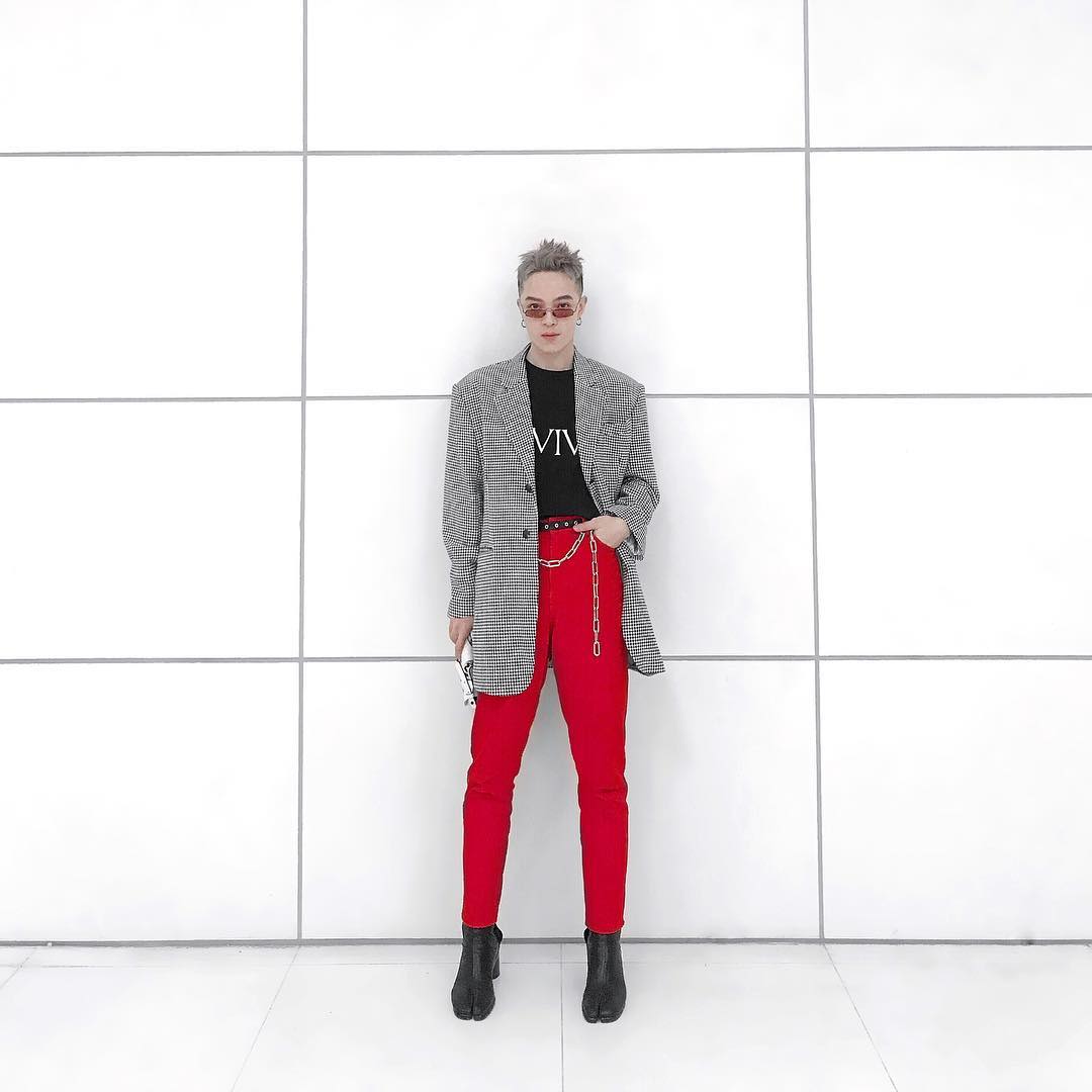 Áo vest ca rô cùng quần tây đỏ là “cây đinh” trong set đồ của Kelbin, giúp anh chàng nổi bật giữa đám đông.