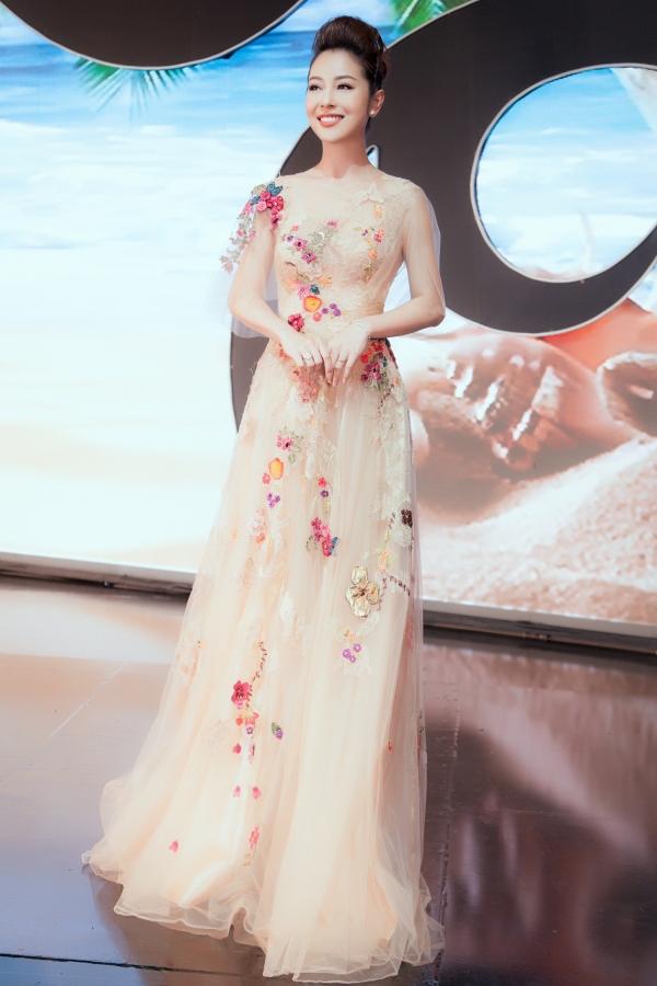 Tham dự sự kiện với vai trò MC, Jenifer Phạm lựa chọn hai bộ váy xòe công chúa nữ tính. Bộ cánh đầu tiên mang sắc hồng nhẹ nhàng, đính kết hoa rơi tỉ mỉ.