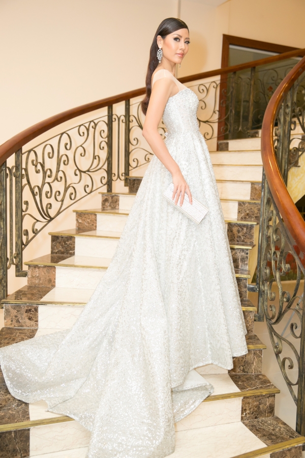 Á hậu Nguyễn Thị Loan thả dáng với váy xòe ánh kim màu bạc. Cách làm tóc cùng phụ kiện nhẹ nhàng góp phần đem đến cho người đẹp dáng vẻ thanh tao, quyến rũ.