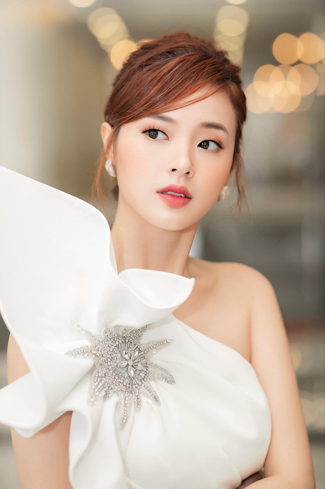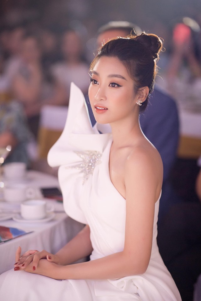Với làn da mịn màng, trắng trẻo, Đỗ Mỹ Linh cực kỳ hợp với chiếc váy tao nhã này.