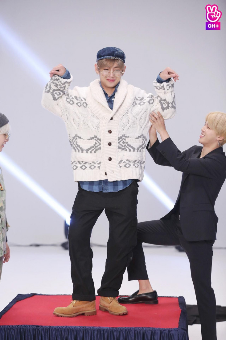 8. Không biết V đang vui hay đang buồn với cây vest ghi lỗi thời này?