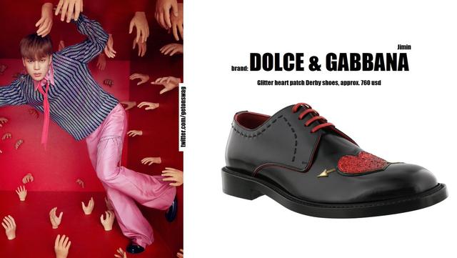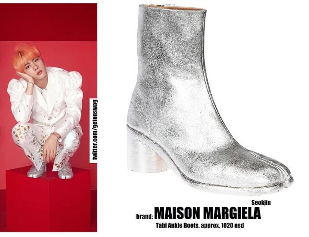 Không biết nên khen stylist của BTS quá táo bạo hay khen Jin quá tự tin mà dám diện đôi giày 'đồng bóng' như thế này. Cùng với quần áo hoa hoét, bèo nhún, ngoại hình của Jin không khác chú hề là bao. Và đôi giày này có giá 'chát' nhẹ: 23 triệu VNĐ.