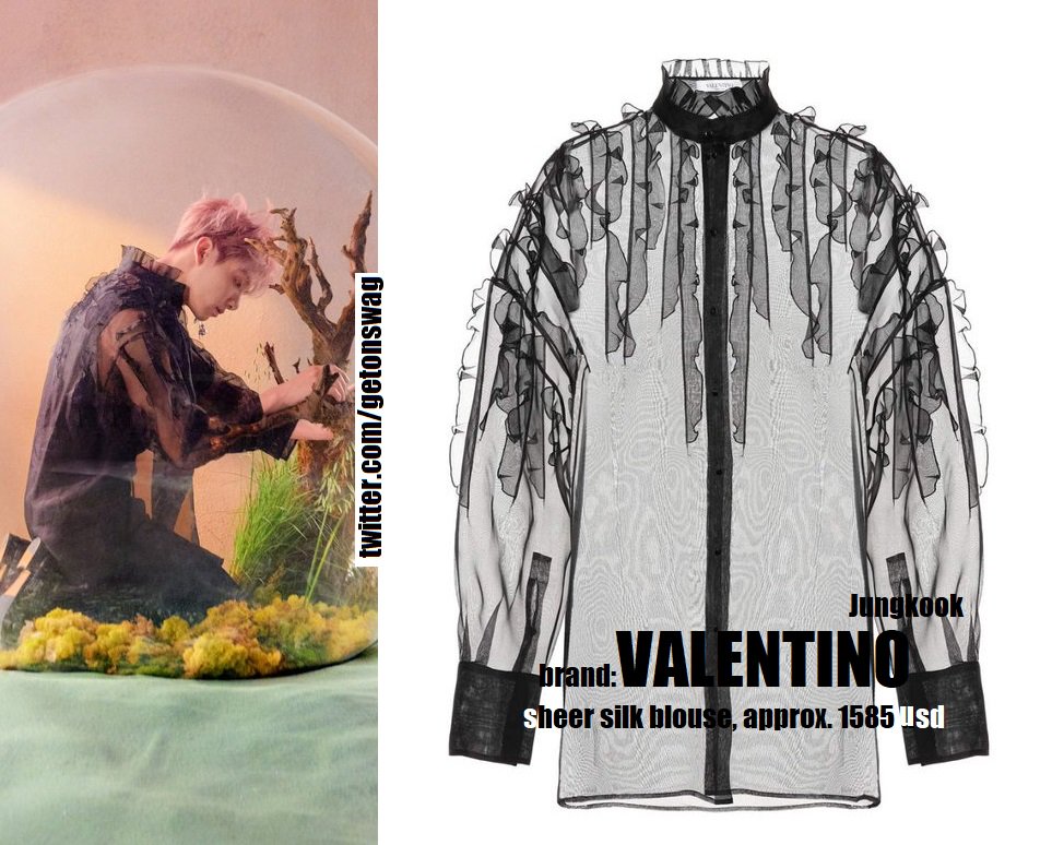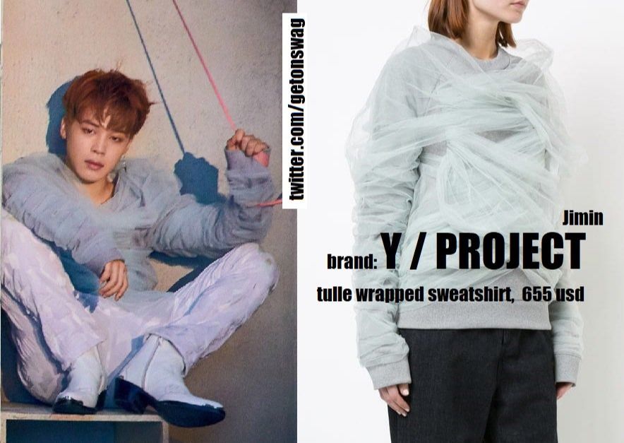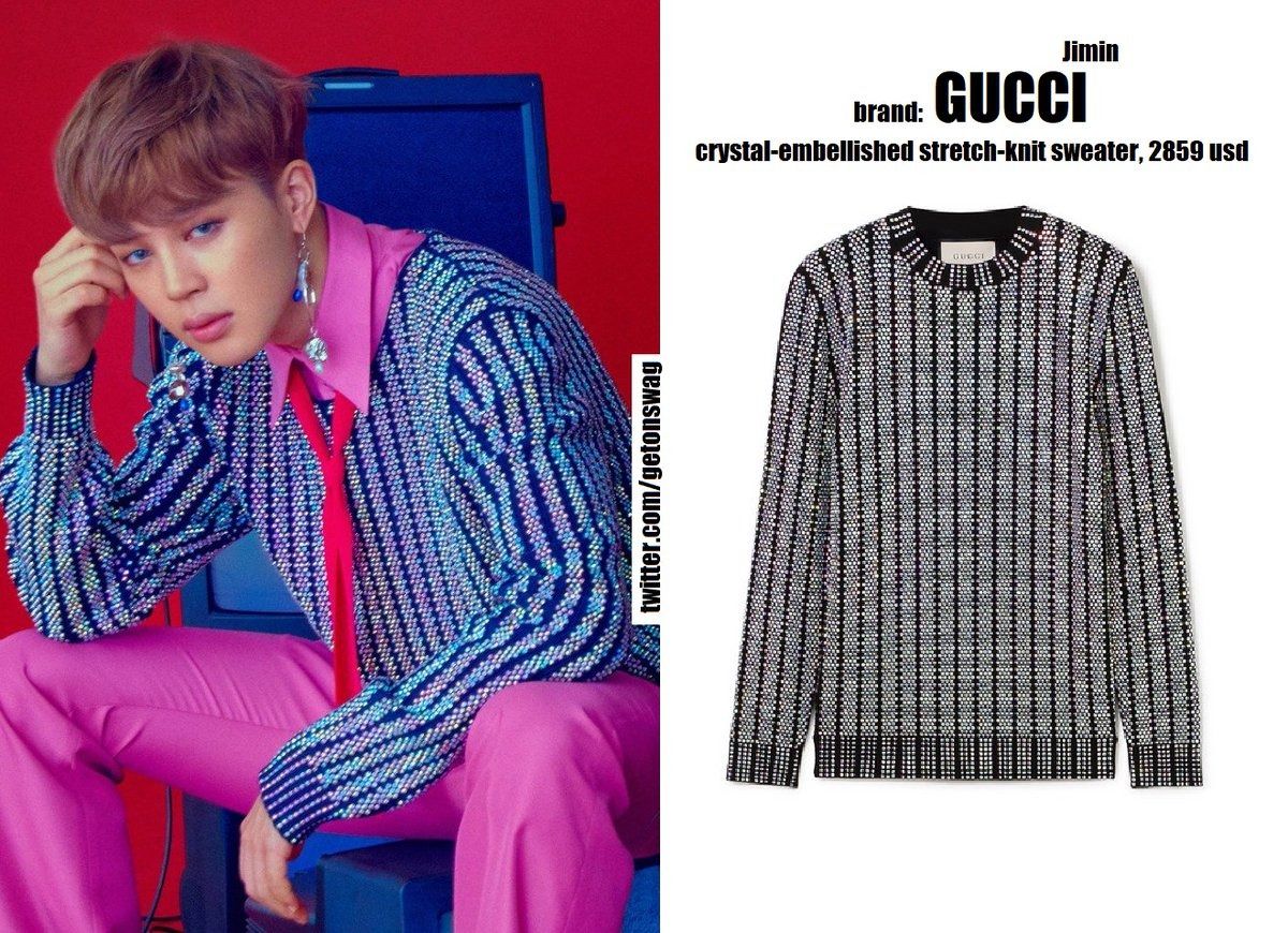 Chỉ là một chiếc áo len nhưng có giá tận 66 triệu VNĐ. Nếu không bị kết hợp với áo sơ mi hồng, quần hồng và khuyên tai dài thướt thì nhìn Jimin sẽ bớt vô duyên hơn.