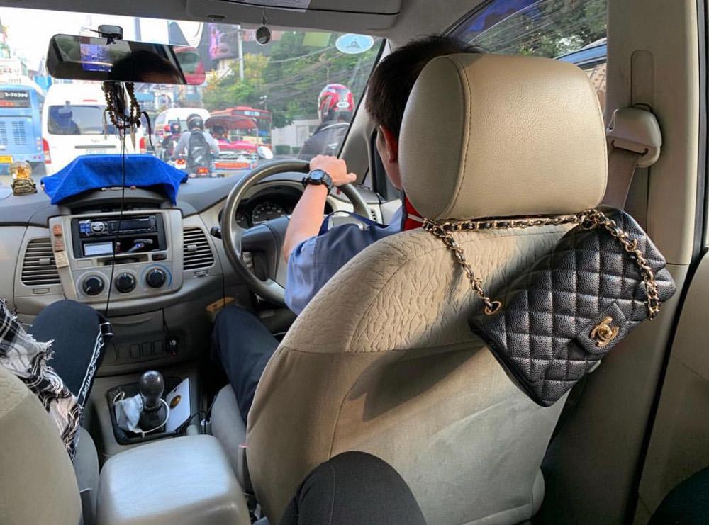 Túi Chanel đắt giá là thế nhưng cũng phải chịu quàng lên ghế lái xe thế này.