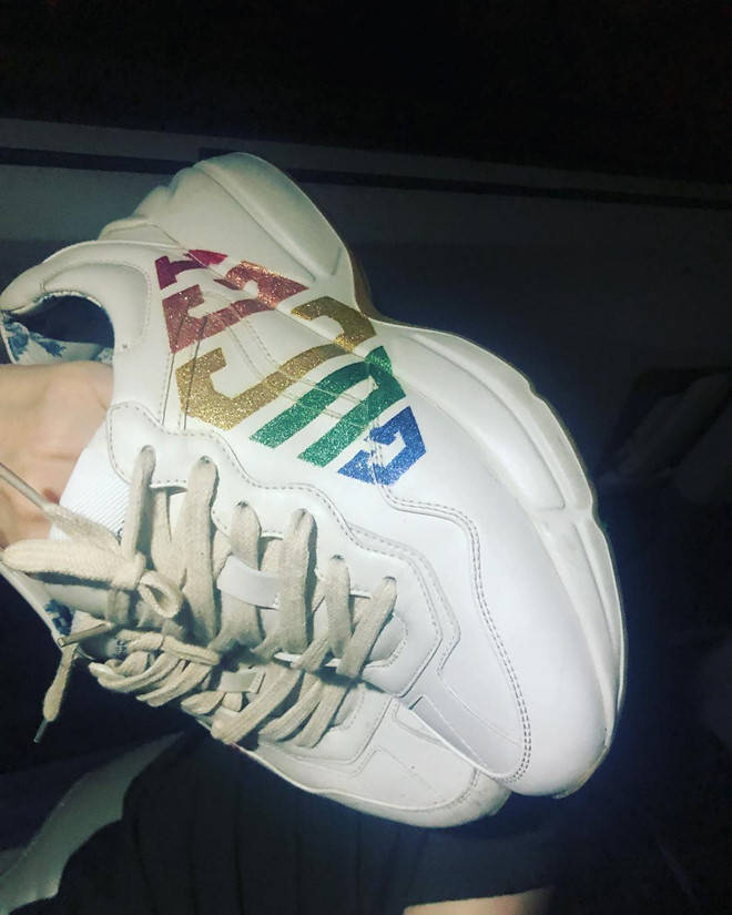 Mẫu sneaker có logo kim tuyến 7 màu của Gucci có giá 1.100 USD (tương đương hơn 25 triệu đồng) cũng nằm trong tủ của Hari.