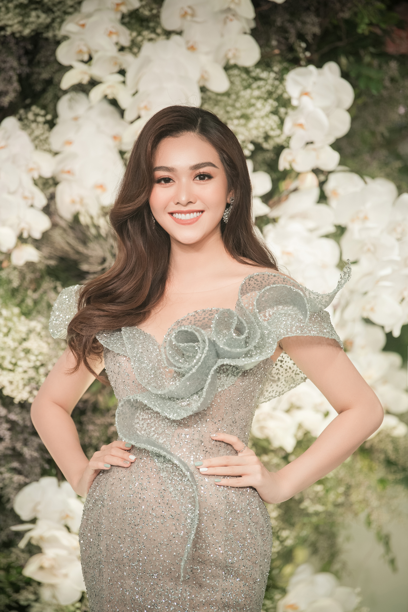 Á hậu Tường San khác biệt nhất với mái tóc xoăn xõa dài, tôn lên gương mặt trái xoan.