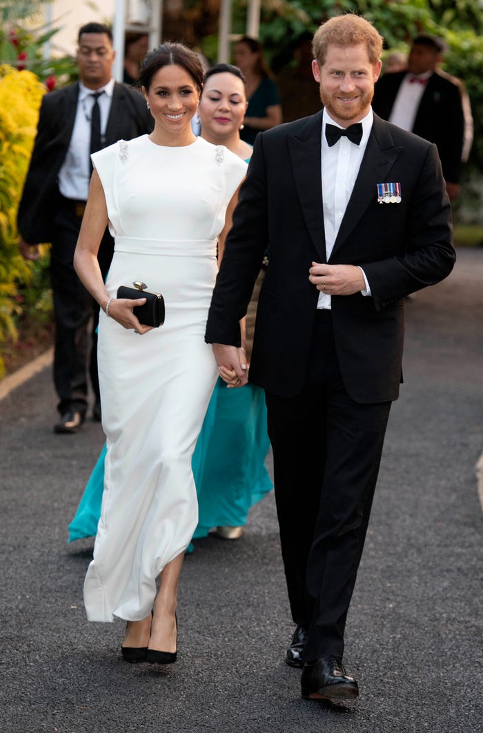 3. Năm 2018, Meghan và Harry mặc đồ đen trắng trong bữa tối cấp nhà nước ở Tonga