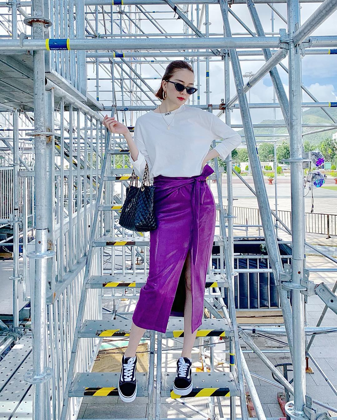 “Mẹ bỉm” Diệp Lâm Anh dẫu con cái “nách mang tay bồng” nhưng vẫn cực kỳ ấn thời thượng khi thả dáng trong mẫu váy wrap màu xanh mix cùng đôi giày bata.