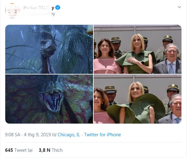 Hãng Johanna Ortiz luôn được khen ngợi với những mẫu váy nữ tính và rất thanh lịch. Các nếp gấp cầu kỳ cùng bèo nhún là điểm đặc trưng, cũng là điểm khiến khách hàng yêu thích các thiết kế của hãng. Nhưng sự cố ‘gió cuốn thôi bay’ của Ivanka đã khiến công chúng so sánh chiếc váy xinh xắn với nhiều hình ảnh ‘hú hồn’ như khủng long bay, bạch tuộc xòe xúc tu, tắc kè bông…