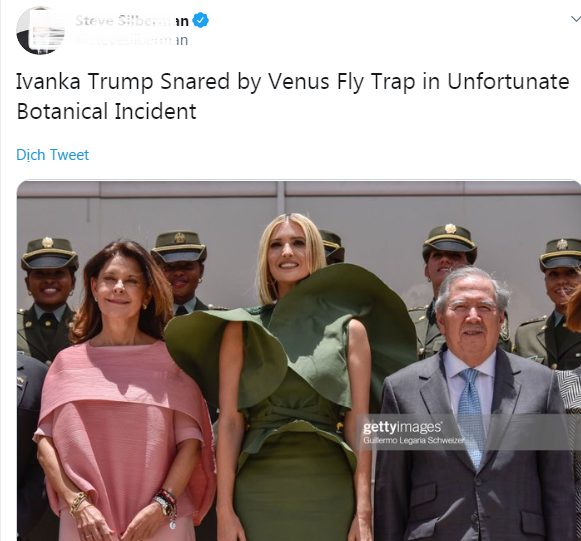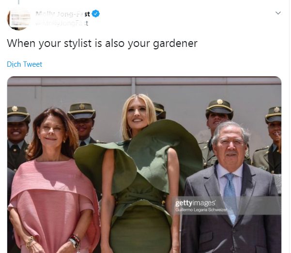 Nhưng mọi thứ bắt đầu có gì đó sai sai khi Ivanka bước ra ngoài trời. Trong lúc chụp ảnh với Phó Tổng thống Colombia Marta Lucia Ramirez, Bộ trưởng Bộ Quốc phòng Guillermo Botero và Thứ trưởng Ngoại giao Hoa Kỳ John J. Sullivan, hai bên tay áo của Ivanka được dịp ‘tung xòe’ như lá rơi mùa thu.