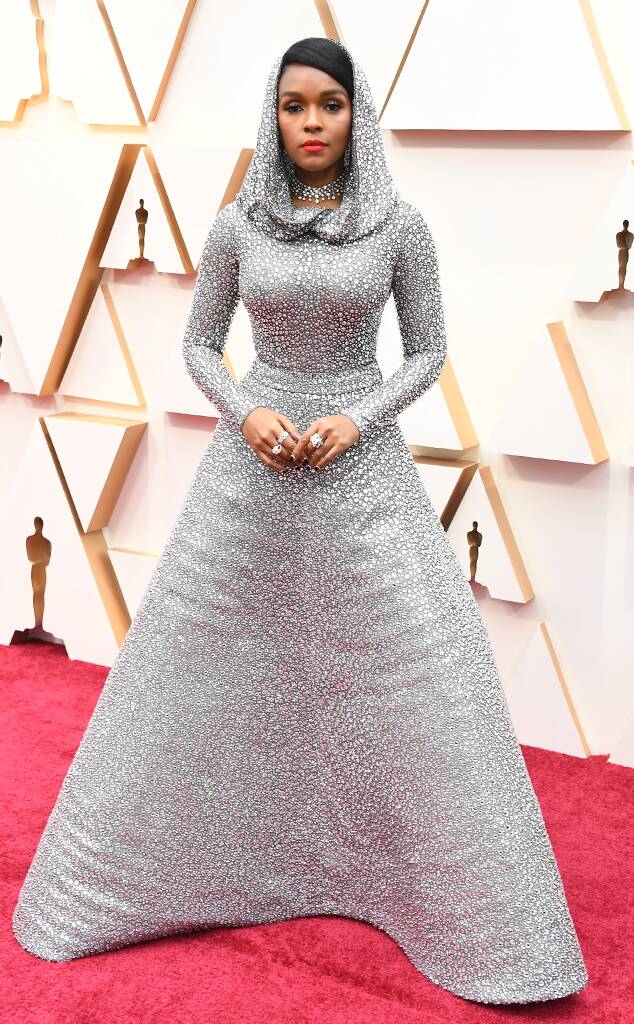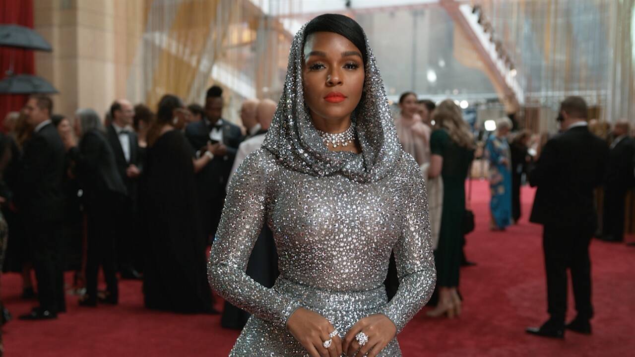 Chiếc mũ trùm đầu đặc biệt khiến Monáe không khoe được những đường tóc tết mọi khi. Nhưng mái tóc mượt mà lộ ra càng làm tăng thêm vẻ sang trọng cho cô. Janelle Monáe chọn cho mình một chiếc vòng pha lê giọt nước mắt tạo sự hòa hợp với bộ trang phục. Phong cách trang điểm của cô lấy cảm hứng từ những người đẹp Hollywood năm 90s. Cô có đôi lông mày rậm, chải chuốt, viền mắt mèo đen lấp lánh, má đỏ ửng và son môi đỏ lì.