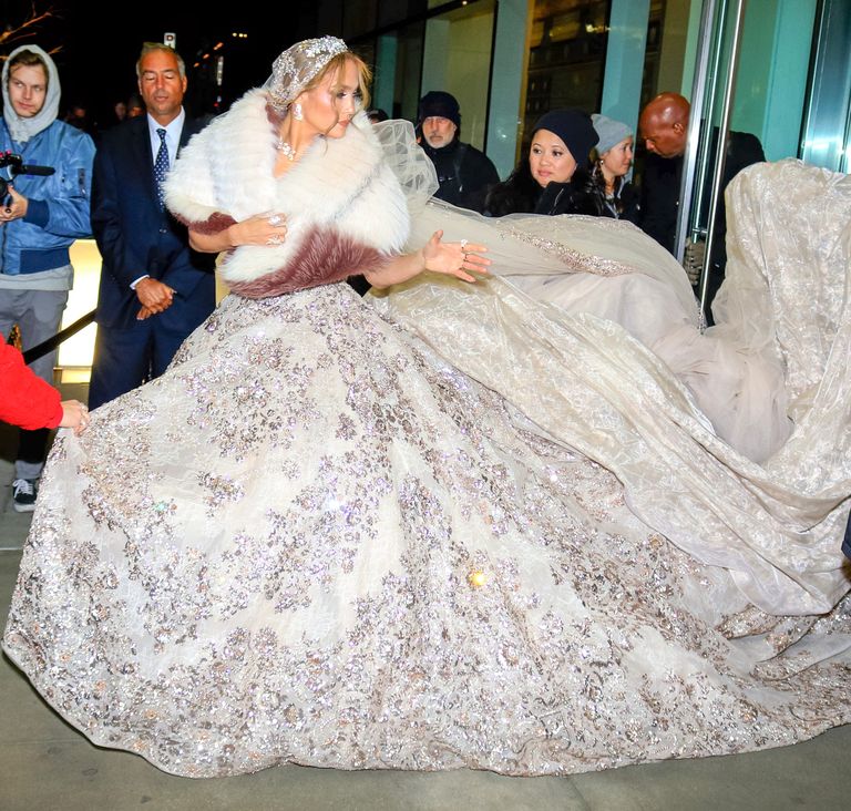 Thử tưởng tượng bạn đang đi dạo trong thành phố New York và đột nhiên nhìn thấy một người đẹp như công chúa đang đứng bên đường thế này. Chiếc váy Zuhair Murad Couture mà JLo mặc được trang trí bằng hàng ngàn sợi kim tuyến thêu tay lấp lánh và cả trăm mét vải để làm đuôi váy.
