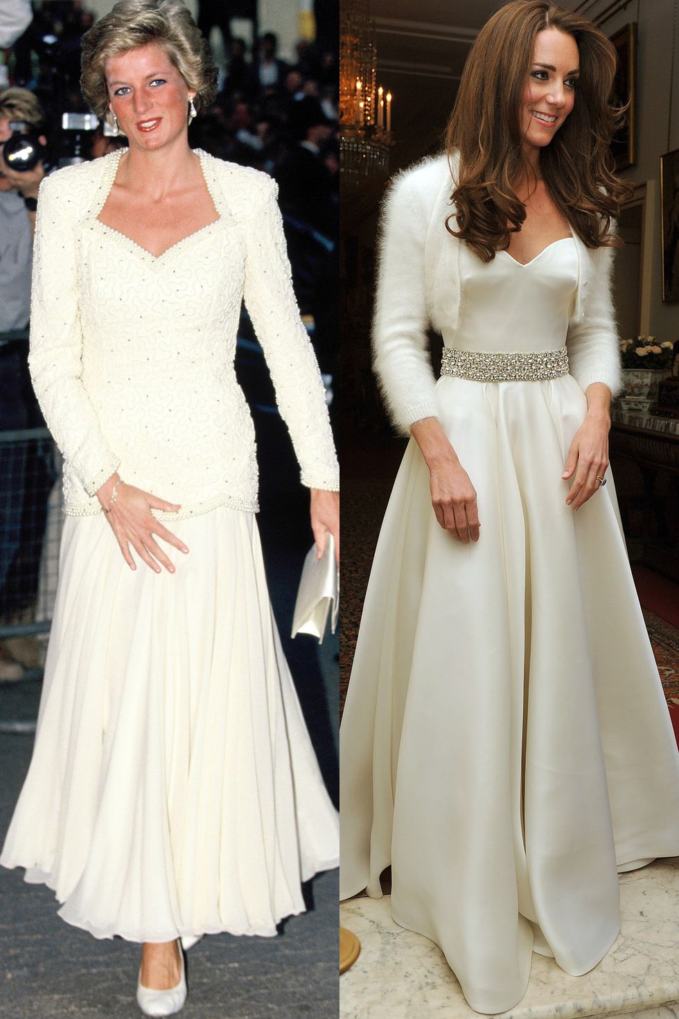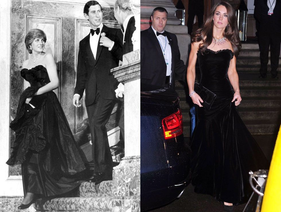 13. Diana mặc chiếc váy cúp ngực này vào năm 1988. Kate mặc nó để tiếp khách sau đám cưới vào tháng 4 năm 2011.
