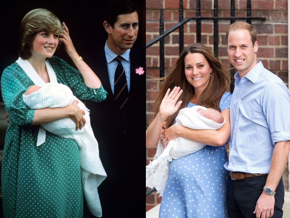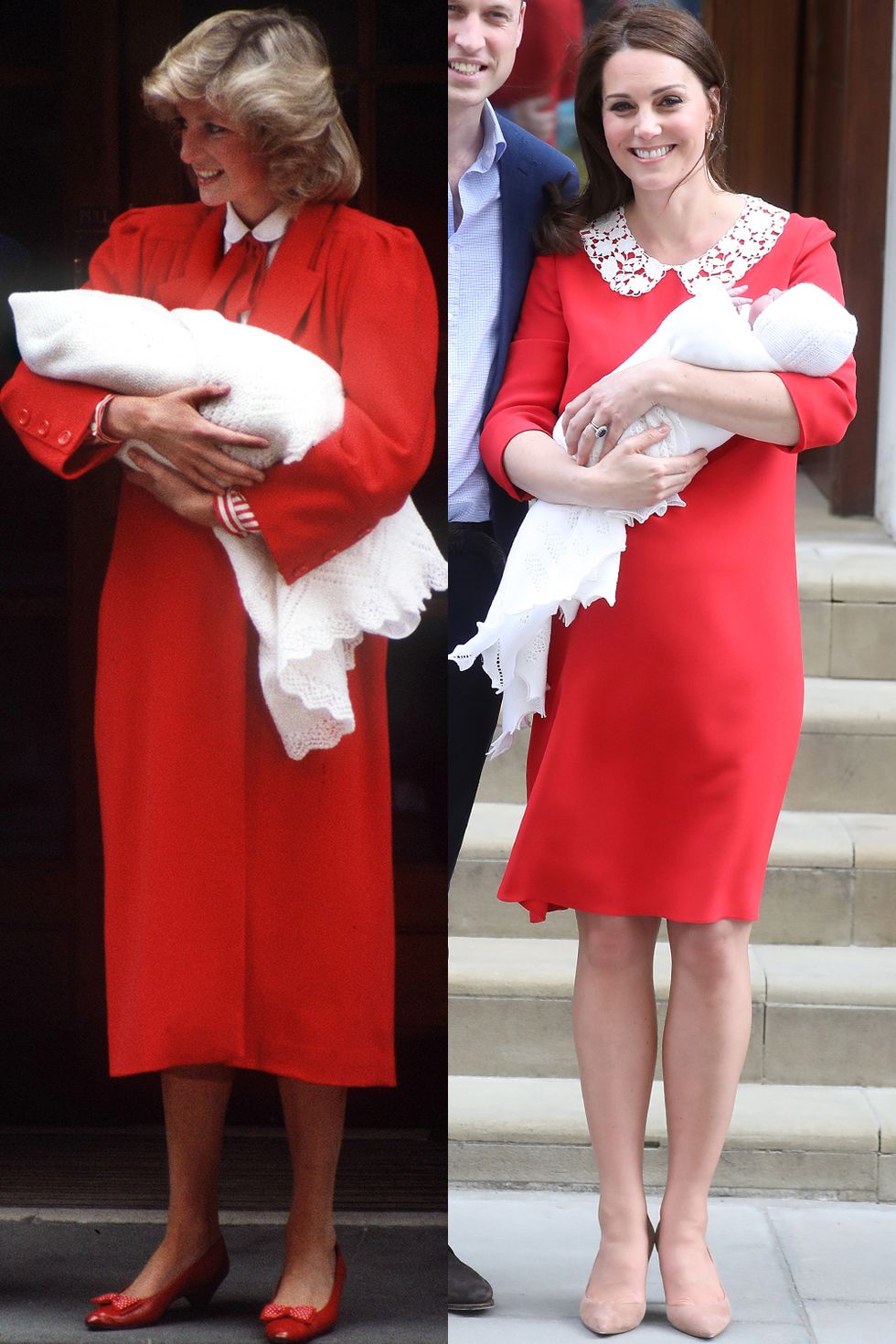 7. Công nương Diana rời Bệnh viện St. Mary cùng Hoàng tử Harry mới sinh năm 1984 với váy và áo khoác màu đỏ. Nữ công tước Kate rời cùng bệnh viện năm 2018 với con trai mới sinh - Hoàng tử Louis cũng mặc mặc váy đỏ có cổ ren trắng. Chắc chắn đây không thể là sự trùng hợp.