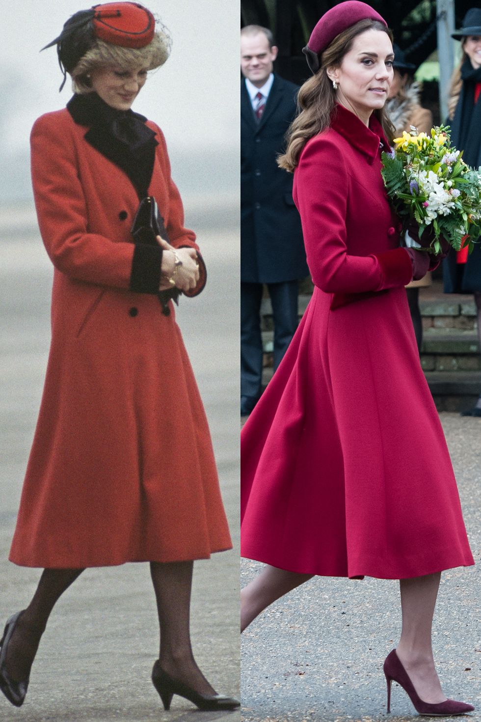 19. Diana xuất hiện đỏ rực Sandringham vào ngày Giáng sinh năm 1993. Kate tham dự cuộc diễu hành tại Học viện quân sự hoàng gia ở Berkshire năm 2006.