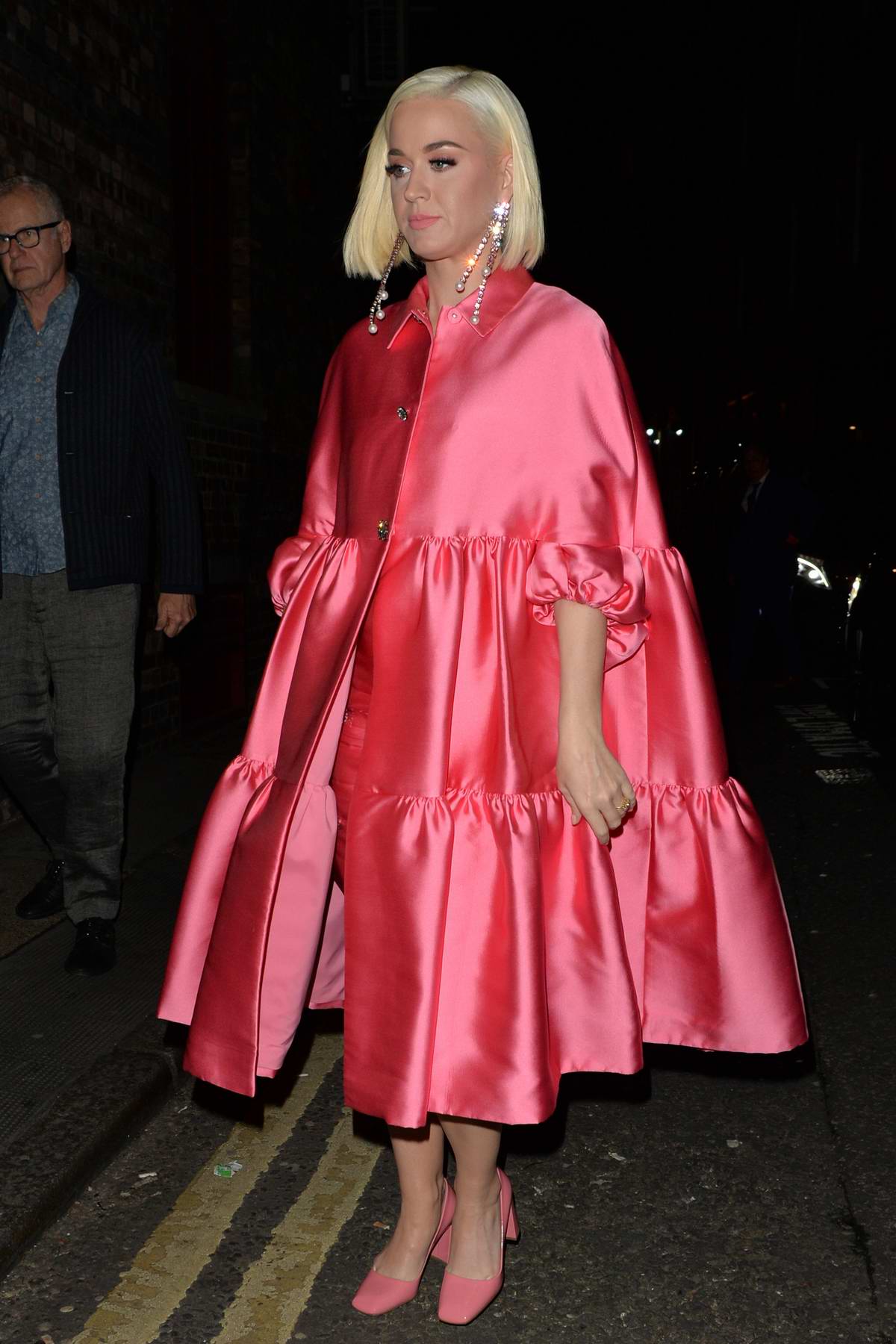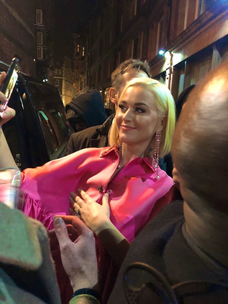 Ngay khi bước xuống xe, Katy Perry đã làm fan ấm lòng với nụ cười rạng rỡ trước cửa Nhà hát Shaftesbury. Chiếc váy hiệu Lela Rose ngoài màu hồng bắt mắt còn có cấu trúc như một chiếc bánh phủ nhiều lớp kem. Hiện chiếc váy đã sold out trên trang web online nhưng phiên bản màu xanh vẫn còn vài chiếc, với giá 2650 đô la (61,582,025 VNĐ).