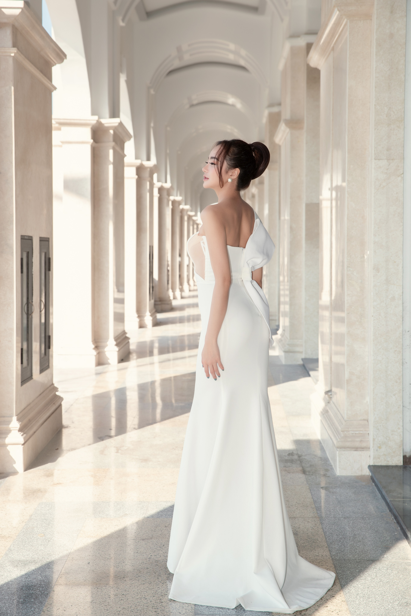 Diện thiết kế tông trắng có phần cúp ngực xuyên thấu lạ mắt, người đẹp trông vô cùng duyên dáng, khiến bao người dõi mắt chẳng rời.