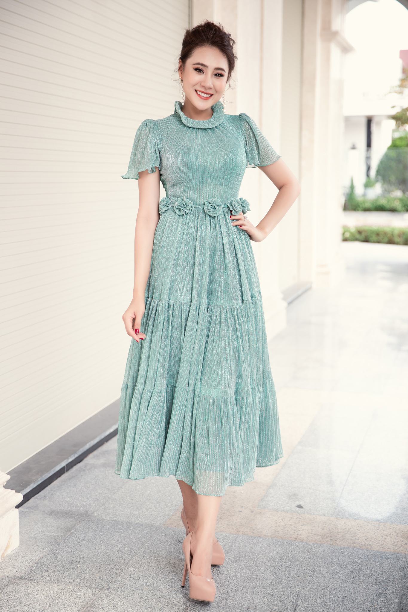 Trong sự kiện còn có diễn viên Hồ Bích Trâm, cô khiến nhiều người chú ý khi thay hai bộ váy khác nhau, đầu tiên là thiết kế tông màu xanh nhẹ nhàng, phom dáng xòe nữ tính.