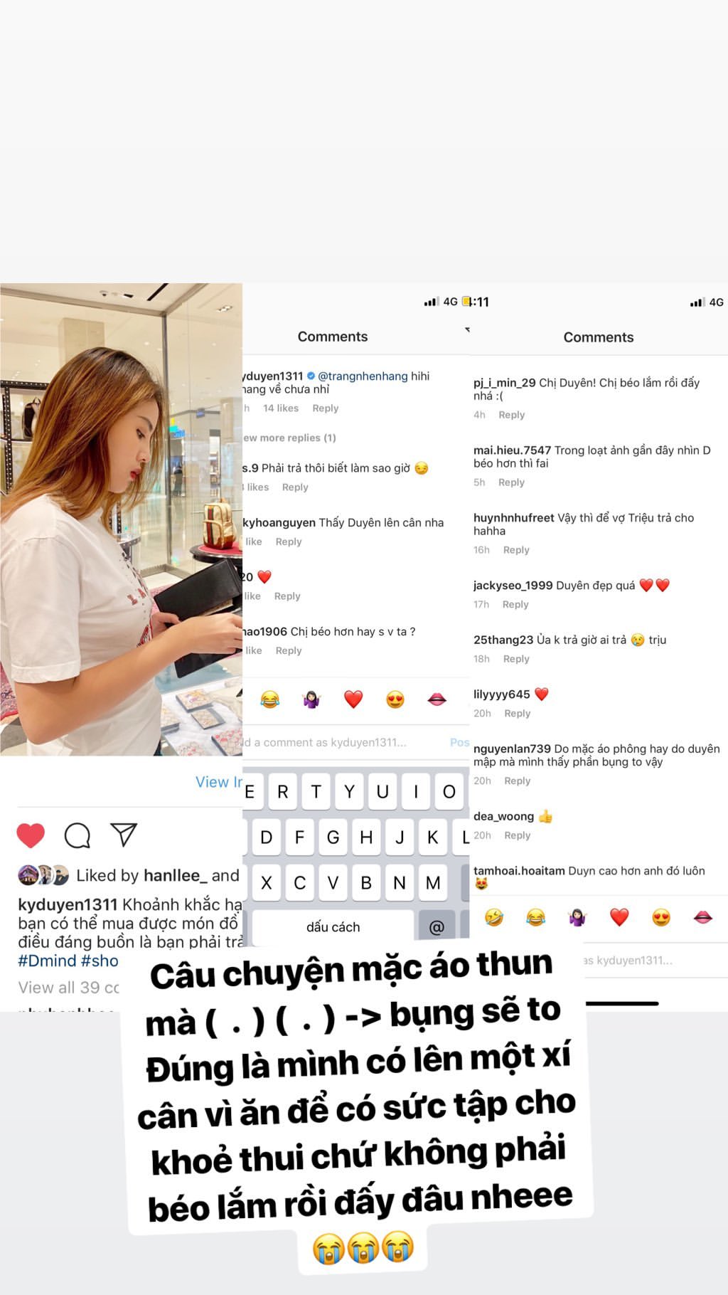 Và trên trang cá nhân của mình, Kỳ Duyên đã lên tiếng về hình ảnh đang được chia sẻ rầm rộ. Nàng hậu chia sẻ “Mặc áo thun mà, bụng sẽ to. Đúng là mình có lên một xíu cân vì ăn để tập cho khoẻ thôi chứ không có phải béo lắm rồi đâu nhé!” đi kèm đó là hình ảnh đang mặc chiếc áo T-shirt trắng để giải thích cho lời mình nói.