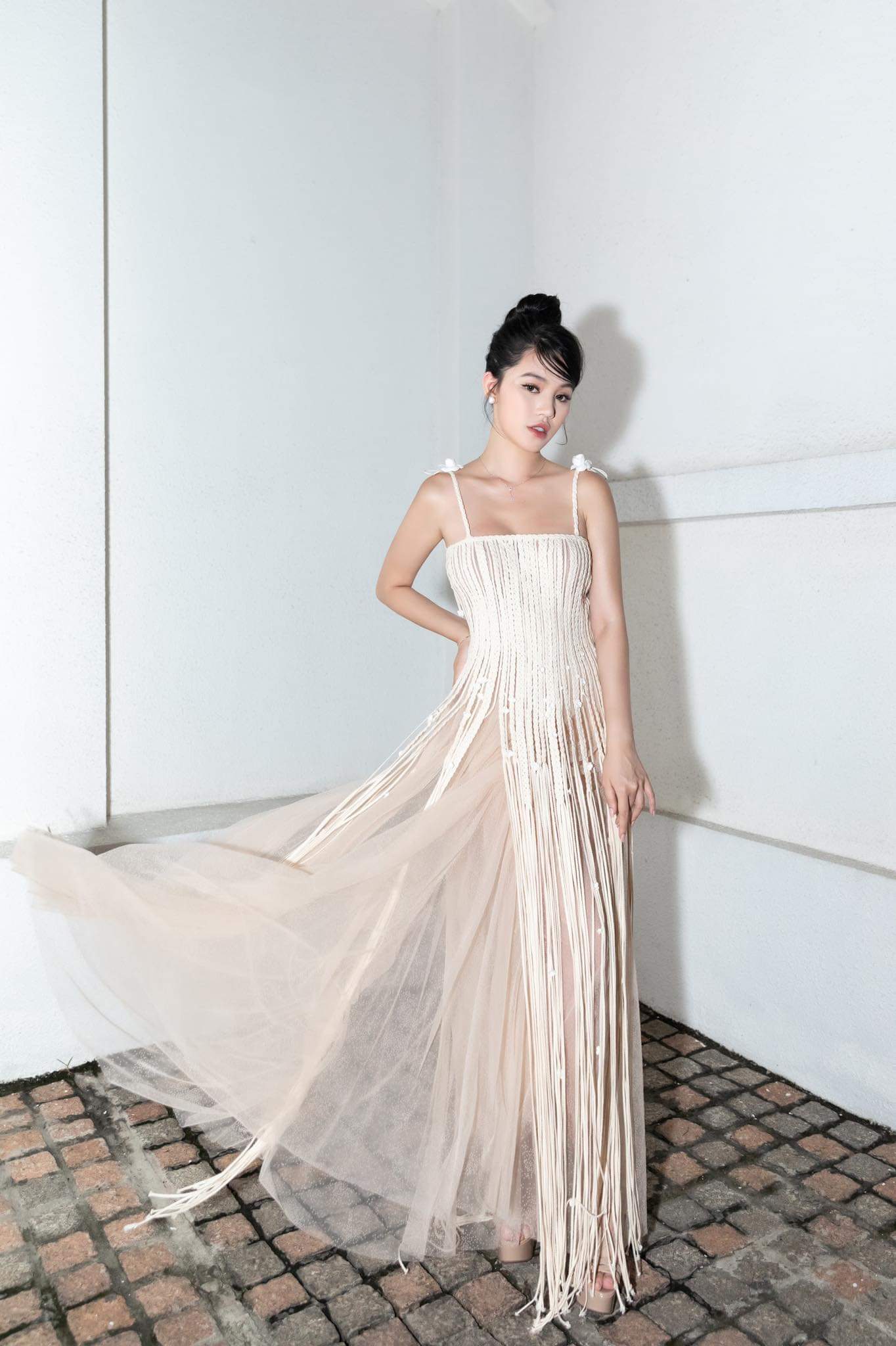 Với gương mặt ngọt ngào, thiết kế tông pastel này quả là phù hợp với Đỗ Mỹ Linh. Chiều cao trội vượt hẳn so với hai mỹ nhân còn lại, nàng hậu là trường hợp duy nhất không cần đến giày cao tít tắp khi diện mẫu đầm dài chấm sàn này.