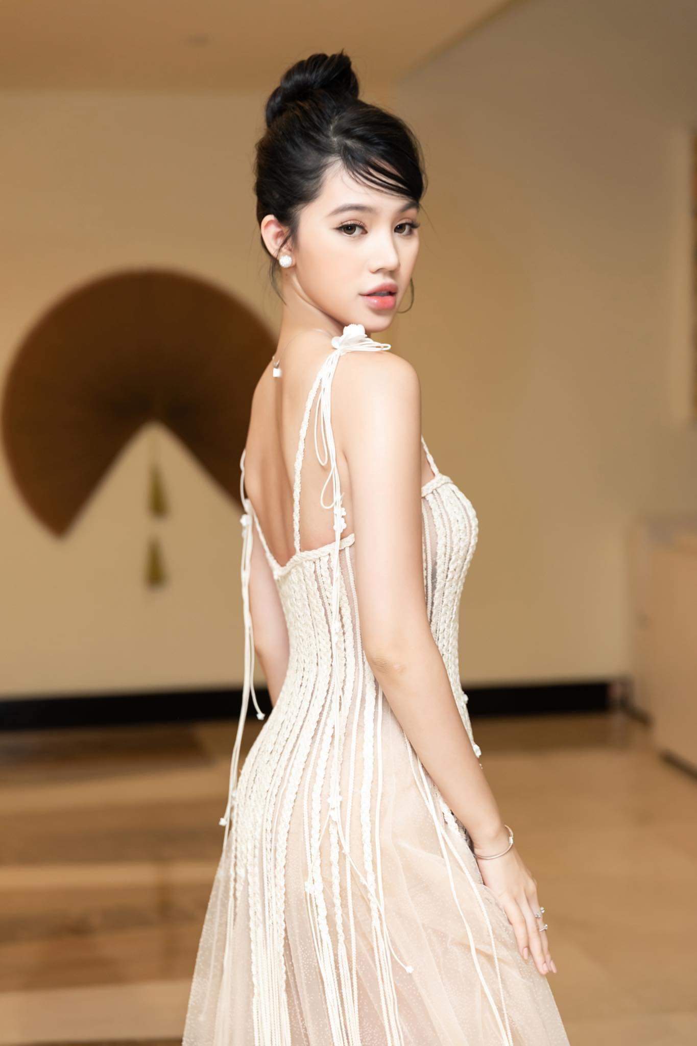 Jolie Nguyễn chọn cho mình lối trang điểm nhã nhặn cùng mái tóc búi cao, theo đó để lộ hết nét đẹp trên gương mặt. Về phần phụ kiện, chân dài chỉ ưu ái đôi hoa tai bản nhỏ, tạo điểm nhấn thu hút một cách thanh nhã.