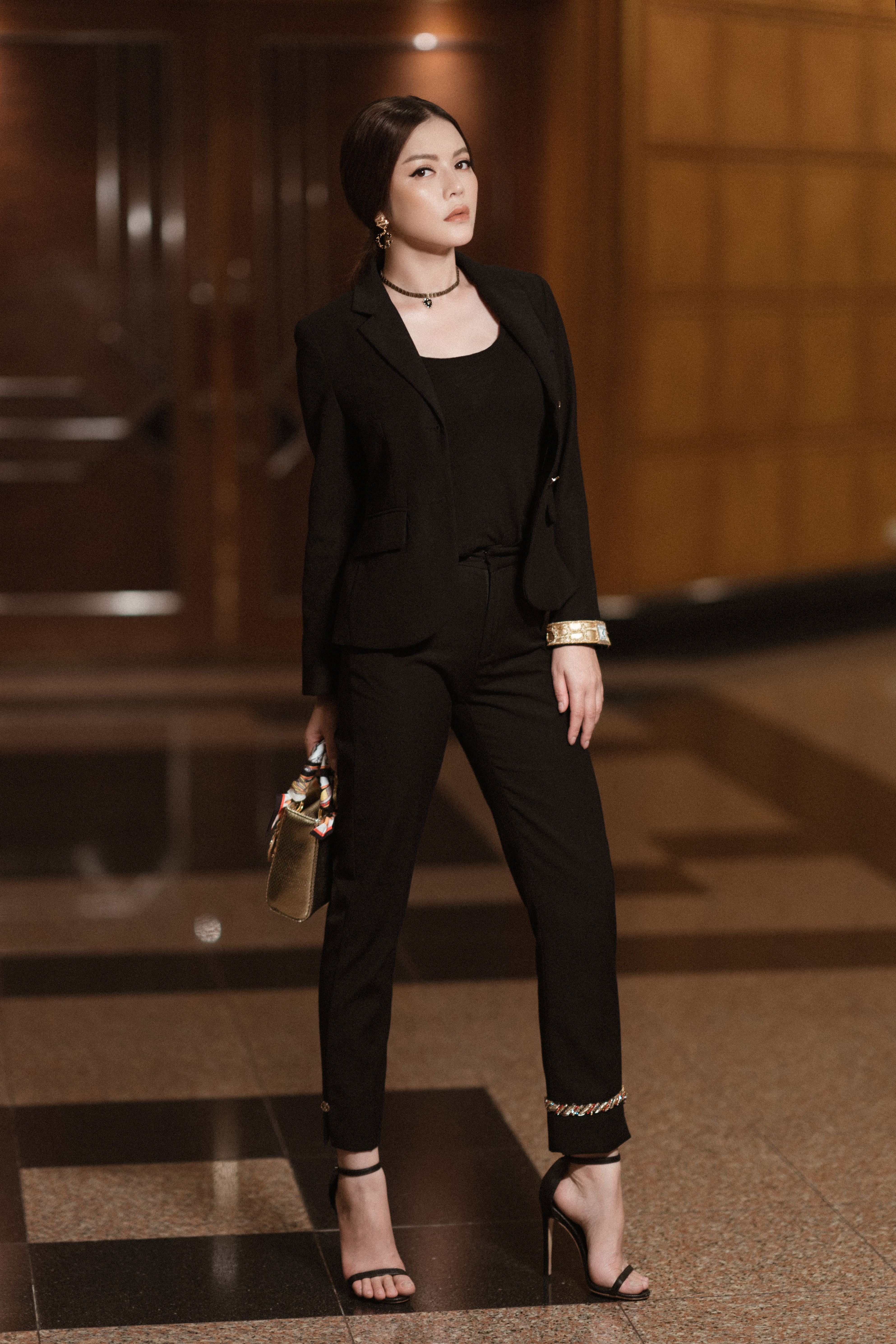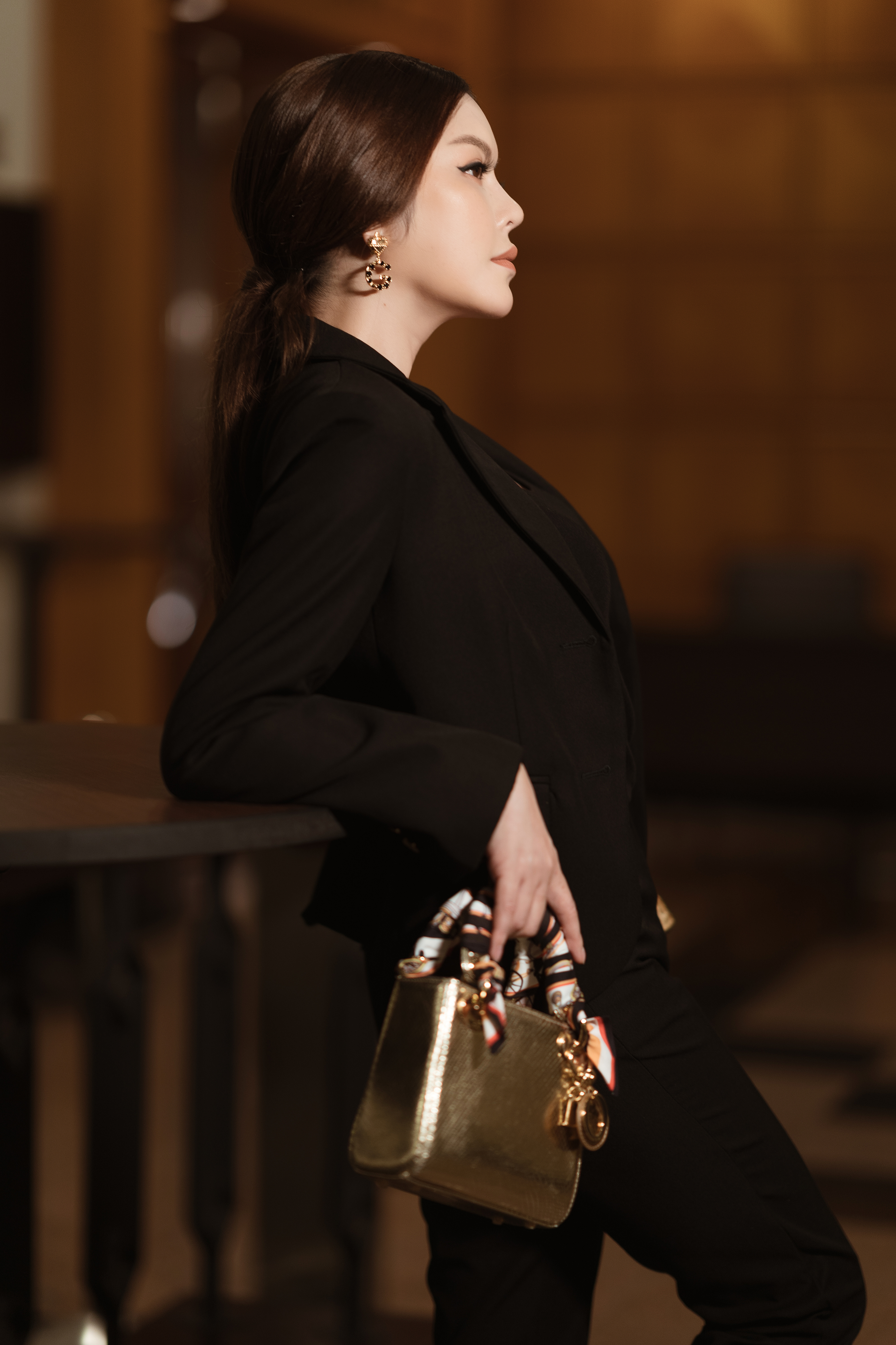 Tuy nhiên, nếu diện cả cây đen sẽ dễ trở nên “chìm nghỉm”, trơn tuột, thế nên người đẹp họ Lý nhấn nhá thêm màu sắc bằng cách sử dụng chiếc túi Dior đắt giá có tông vàng đồng, hài hòa cùng chi tiết dưới lai quần và tay áo.