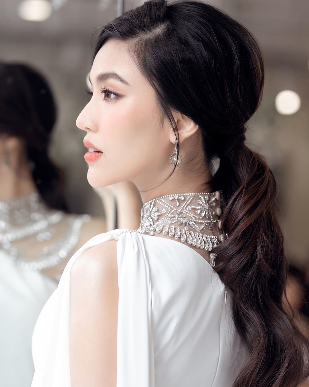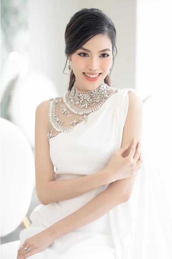 Diện 1 thiết kế váy trắng suông, hở vai với điểm nhấn chính là phần cổ đính đá, Lan Khuê khoe trọn được vóc dáng thanh thoát của mình. Mặc dù đã ở những tháng giữa thai kỳ thế nhưng vòng 2 của Lan Khuê dường như “biến mất” với thiết kế này.