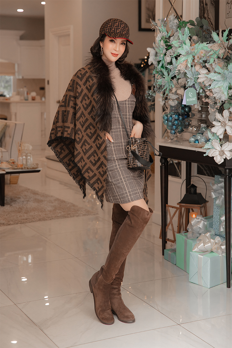 Thanh Mai chọn set đồ gồm áo len, chân váy và áo choàng, thích hợp không khí se lạnh mùa đông.
