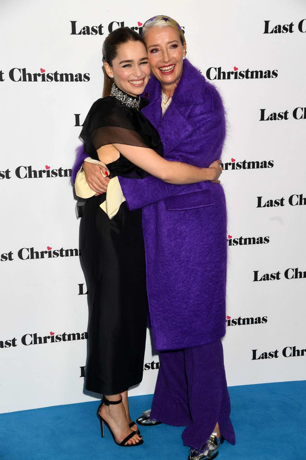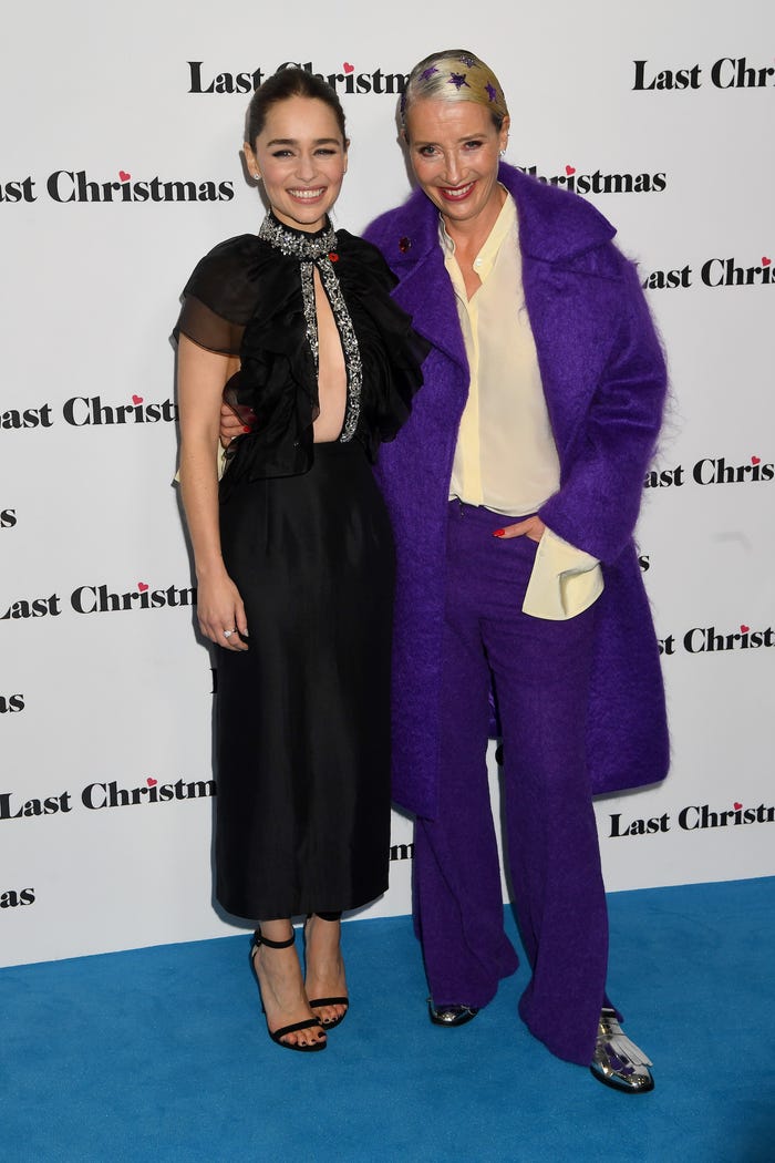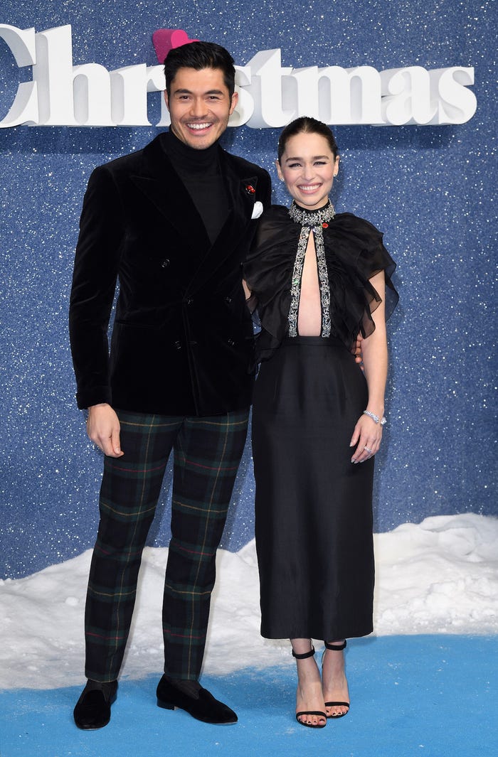 Trên thảm đỏ, Clarke không quên tạo dáng cùng hai bạn diễn: Emma Thompson và Henry Golding. Henry mặc áo vest nhung, cổ lọ đen, quần kẻ xanh (nam diễn viên nhắc nhẹ là muốn bắt chước màu cây thông Noel).