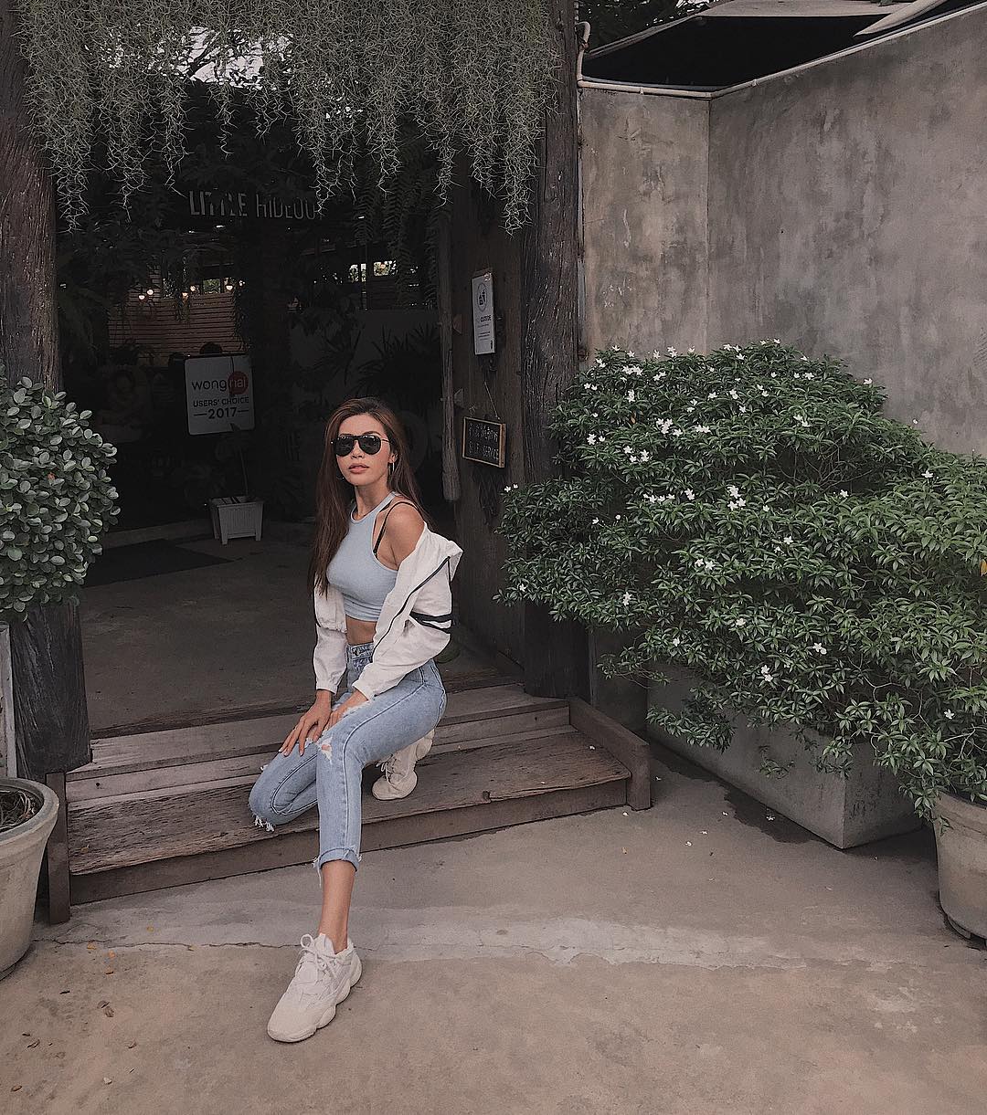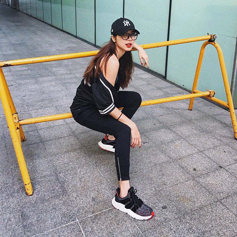 Chiếc áo vốn thuộc về phòng tập, được Khánh Linh The Face vận dụng sáng tạo trong trang phục xuống phố.