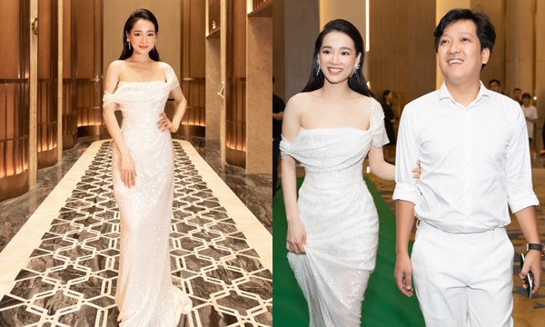 Ngay từ khi xuất hiện, người đẹp đã gây sự chú ý khi diện đầm trắng hở vai trần, khéo khoe đường cong cơ thể. Bên cạnh nữ diễn viên “Tuổi thanh xuân” là ông xã Trường Giang giản dị với quần tây, áo sơ mi trắng cùng tông với bà xã.
