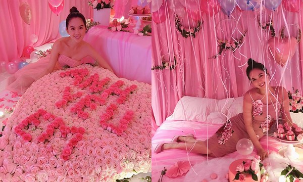 Tiệc sinh nhật của nữ hoàn nội y Ngọc Trinh được tổ chức hoành tráng trong tone hồng “sến”. Ngọc Trinh cũng diện trang phục tone sur tone với chiếc váy hồng ôm sát.