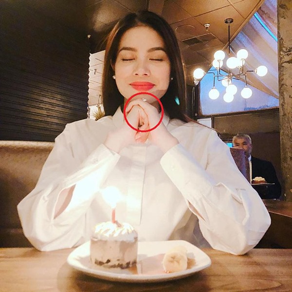 Phạm Hương giản dị với chiếc áo sơ mi trắng trong ngày sinh nhật, dù đơn giản nhưng người đẹp cũng làm sát thương bao chàng trai khi đeo chiếc nhẫn ngay ngón áp út.