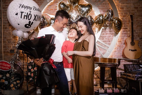 Trong khi đó, bà xã Tuấn Hưng lại xuất hiện khá mộc mạc trong tiệc mừng sinh nhật do Tuấn Hưng tổ chức. Vì mỹ nhân đang trong thời kì thai nghén nên không ăn diện, chỉ xuất hiện trong chiếc váy bầu dáng suông thoải mái tôn lên làn da mịn màng dù đã lần thứ 3 mang thai.