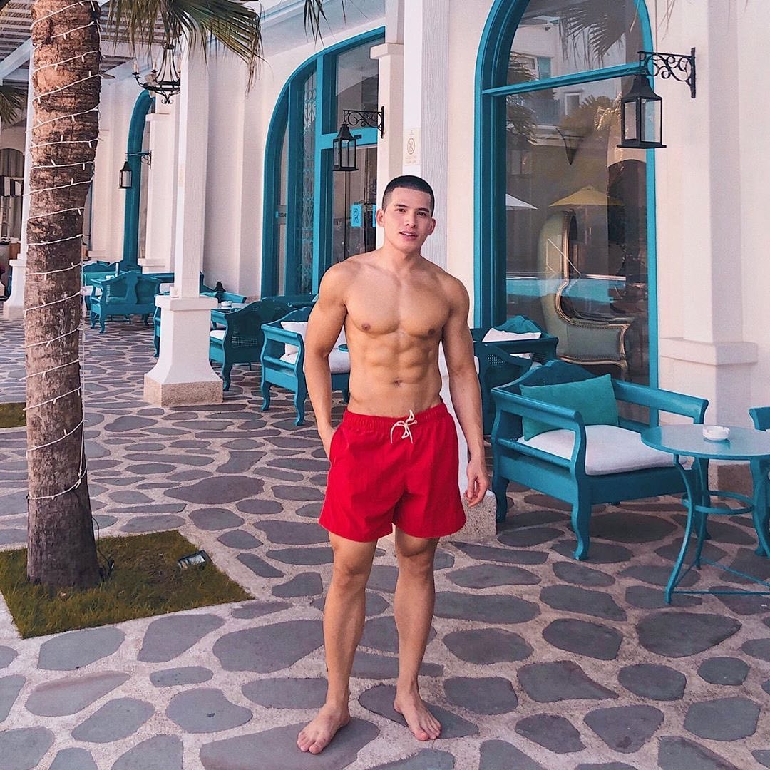 Quốc Thiên khoe cơ bụng săn chắc với quần short rực rỡ tươi tắn mang phong vị mùa hè.