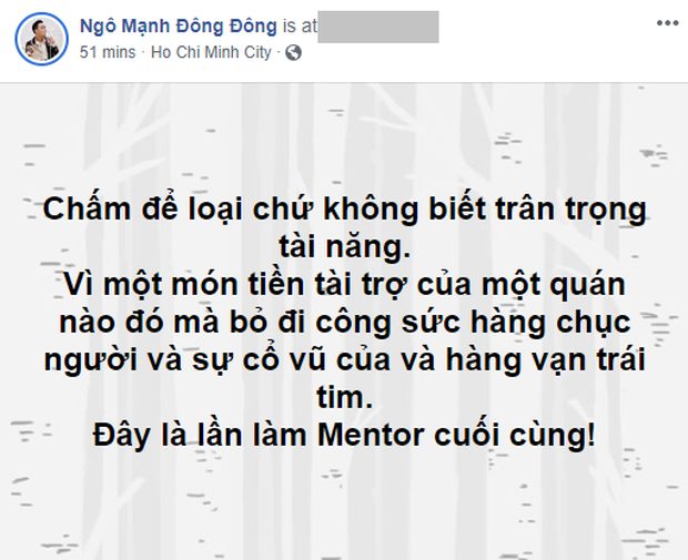 Cụ thể, anh đăng tải dòng chia sẻ: “Chấm để loại chứ không biết trân trọng tài năng, vì món tiền tài trợ của một quán nào đó mà bỏ đi công sức hàng chục người và sự cổ vũ của hàng vạn trái tim.”