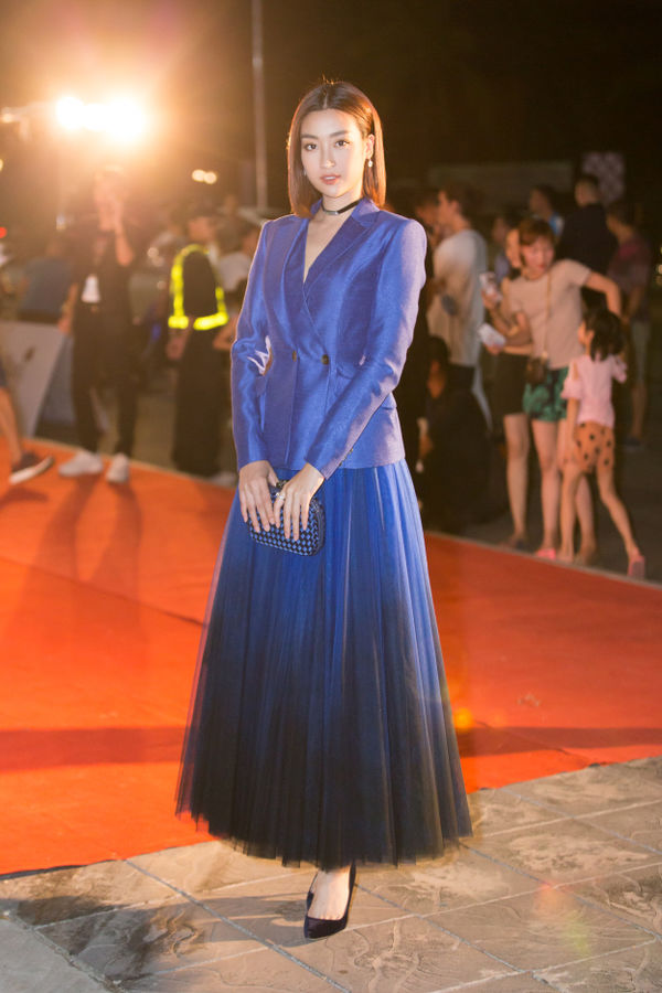 Đỗ Mỹ Linh mang đến hình tượng một cô gái thanh tao, nhã nhặn vói áo vest và chân váy dập pli xòe bồng.
