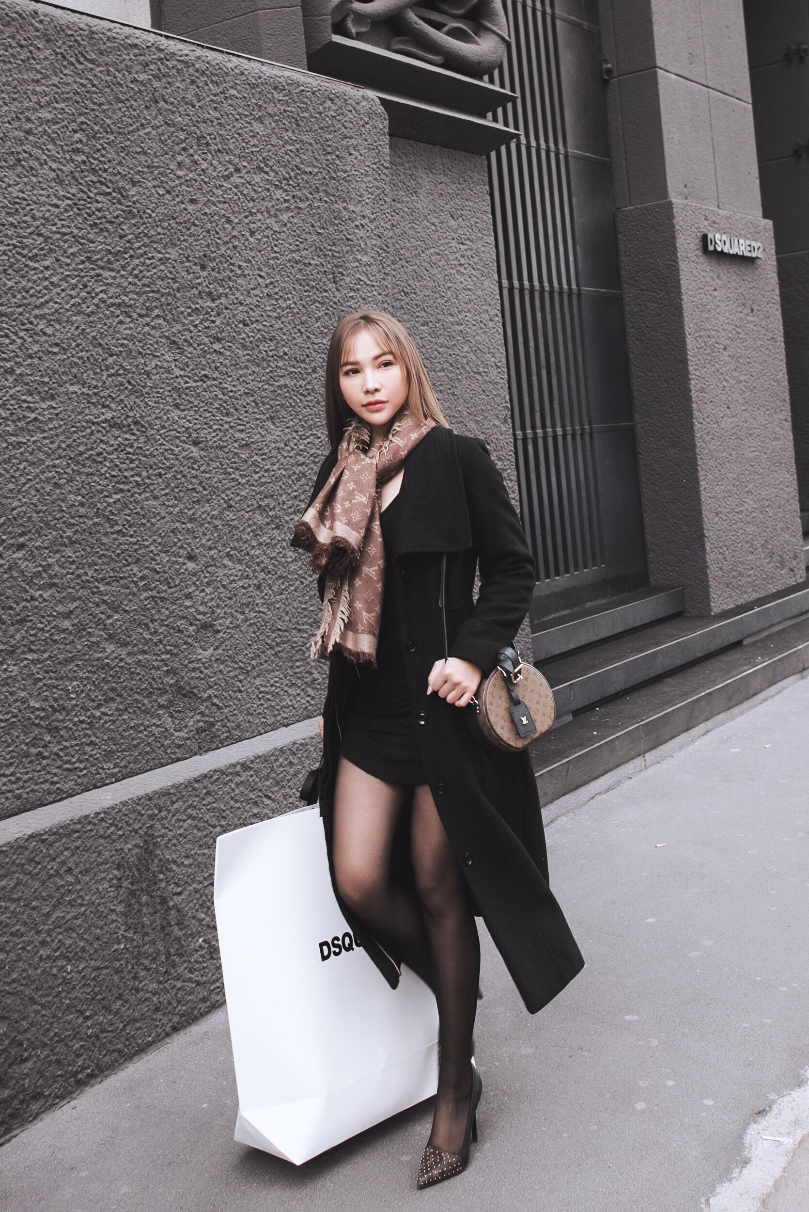 Quỳnh Thư điểm xuyến trên trang phục nguyên cây đen bằng khăn quàng cổ và túi xách của nhà mốt LV