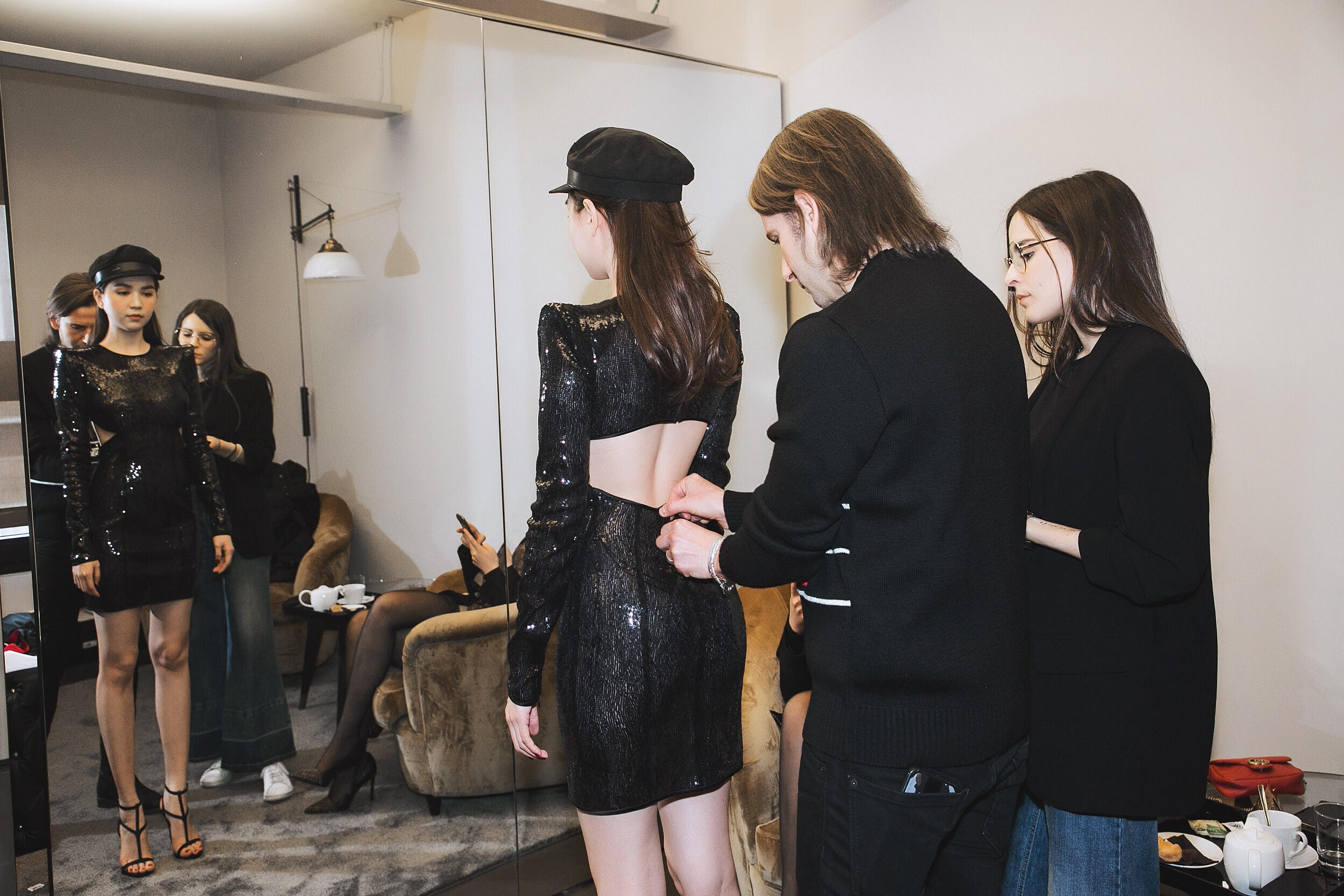 Chân dài cũng tất bật tranh thủ thử đồ cho tuần lễ thời trang Milan cận kề trong chiếc đầm đen ôm sát lấp lánh đội cùng mũ baker boy