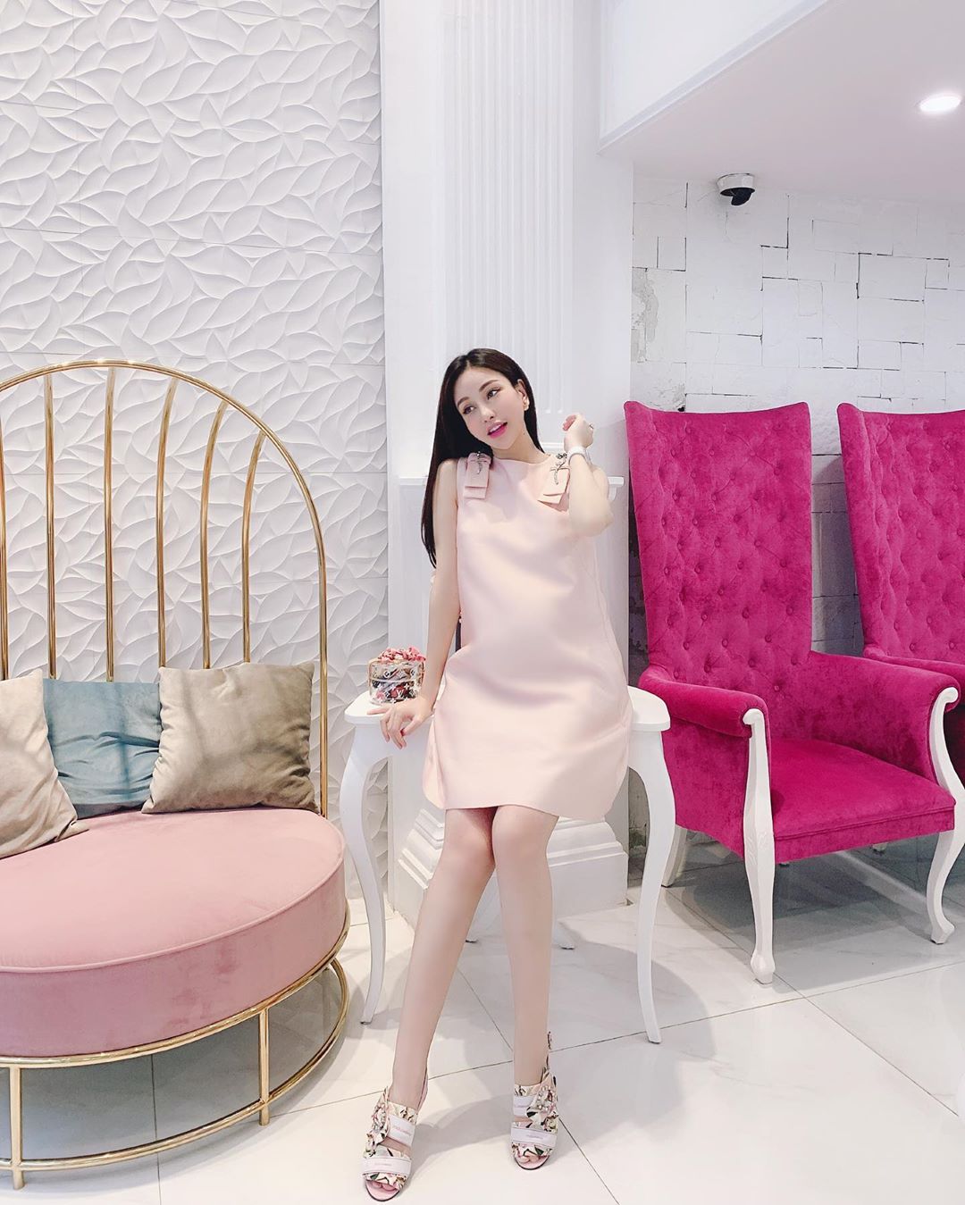 Hoa hậu Lam Cúc tiếp tục giữ vững hình ảnh nhẹ nhàng, thanh tao trong chiếc váy phom suông, gam màu pastel.