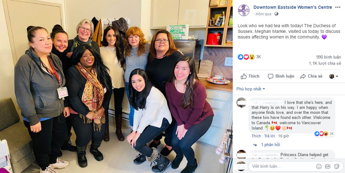 Hoạt động có ý nghĩa nhất của Meghan sau kỳ nghỉ lễ dài hơn một tháng là đến thăm một trung tâm phụ nữ ở Vancouver. Họ đã có khoảng thời gian chia sẻ vui vẻ và tài khoản của trung tâm cảm ơn Meghan bằng caption: “Hãy nhìn xem hôm nay chúng tôi uống trà cùng ai? Nữ công tước xứ Suss*x, Meghan Markle đến thăm chúng tôi để thảo luận về các vấn đề gây ảnh hưởng đến phụ nữ trong cộng đồng”.