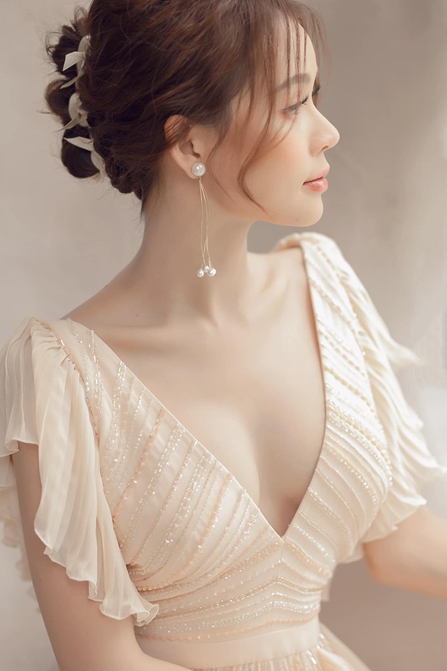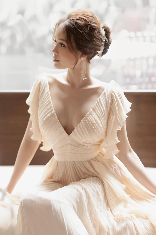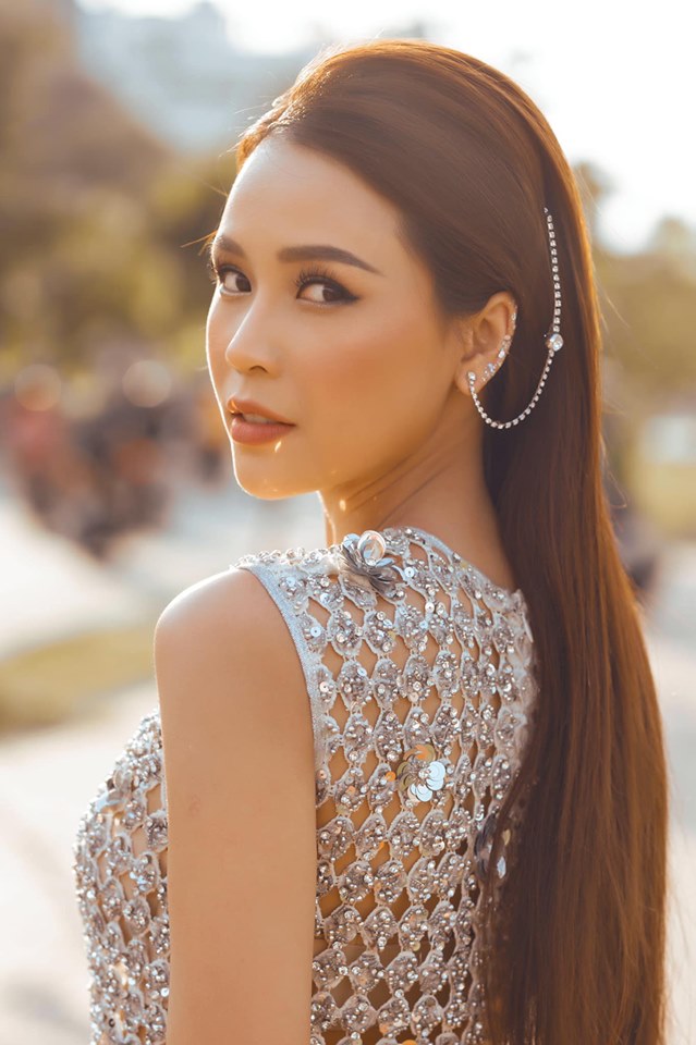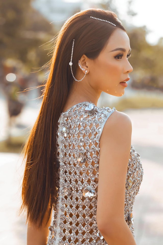 Ngoài ra, đôi hoa tai dáng dài, hạt kết trên tóc cũng được sử dụng nhằm tạo nên tổng thể hoàn hảo.