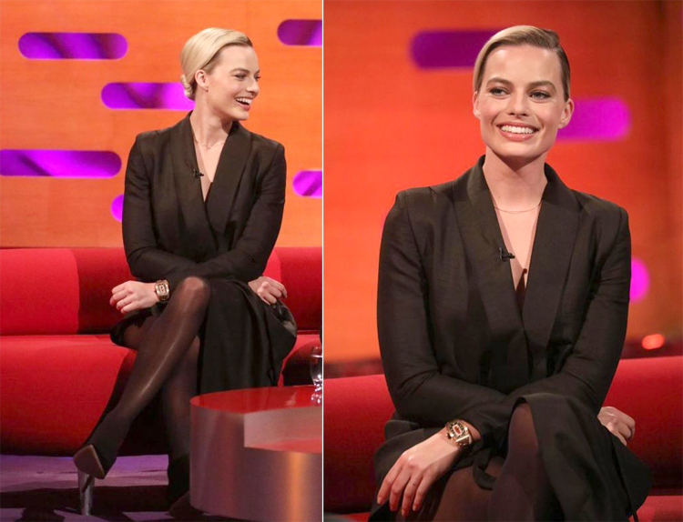 Margot Robbie là ngôi sao tiếp theo, sau Kim Kardashian West, Evan Rachel Woods và Emilia Clarke, lăng xê xu hướng mặc áo blazer nhưng không mang áo lót.