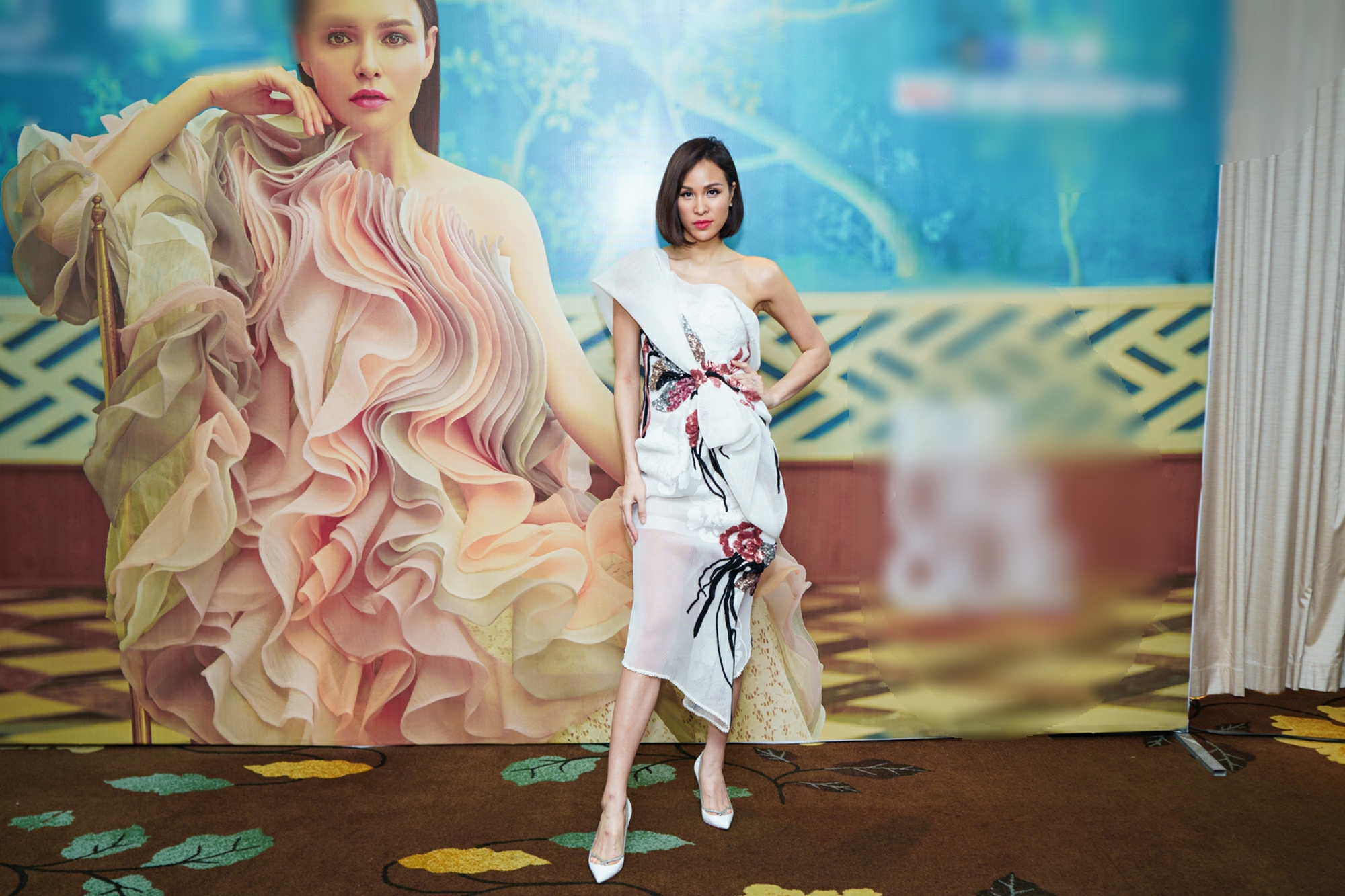 Sau đó, cô tiếp tục thay một bộ váy trắng lệch vai có đính kết hoa 3D khá nổi bật.