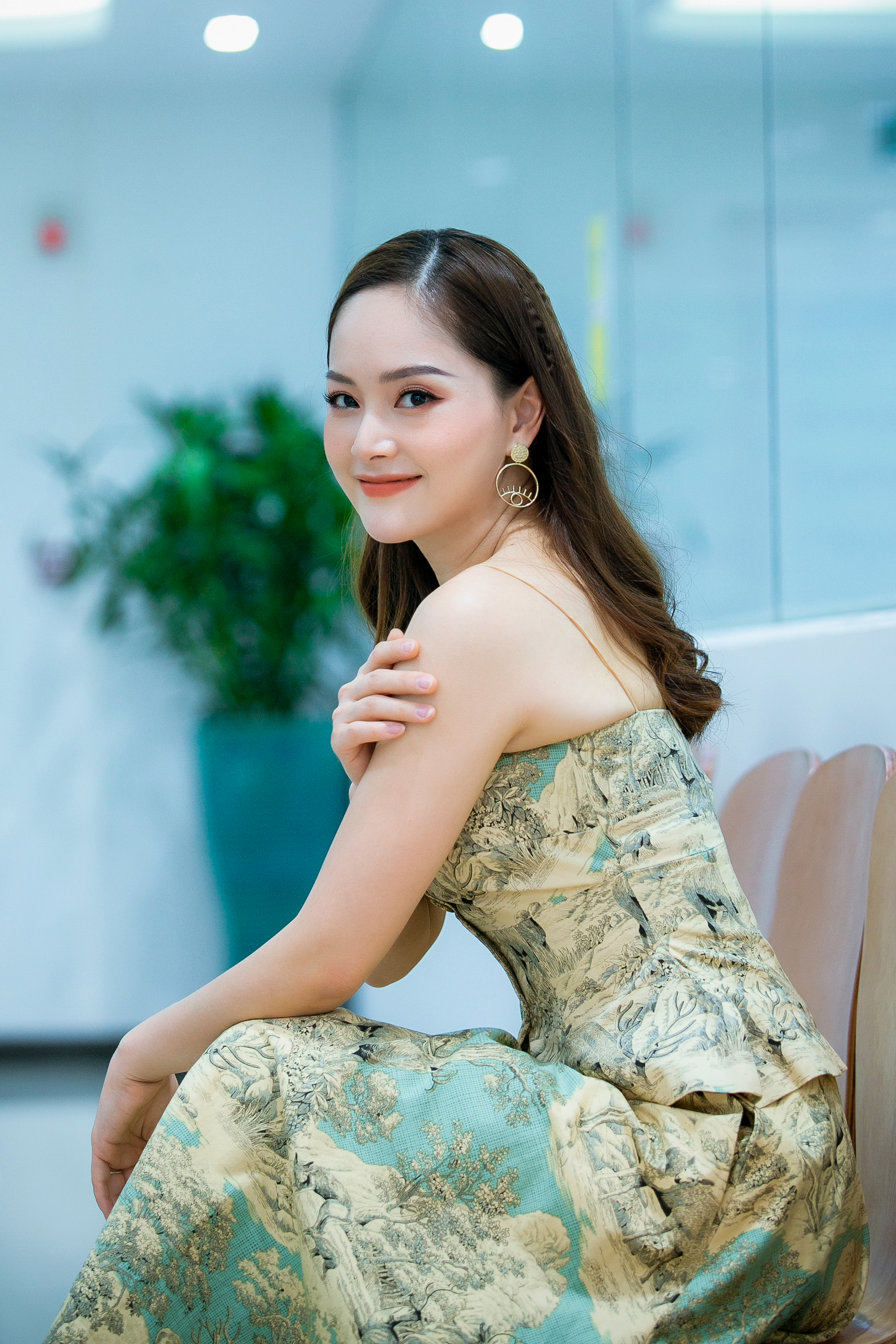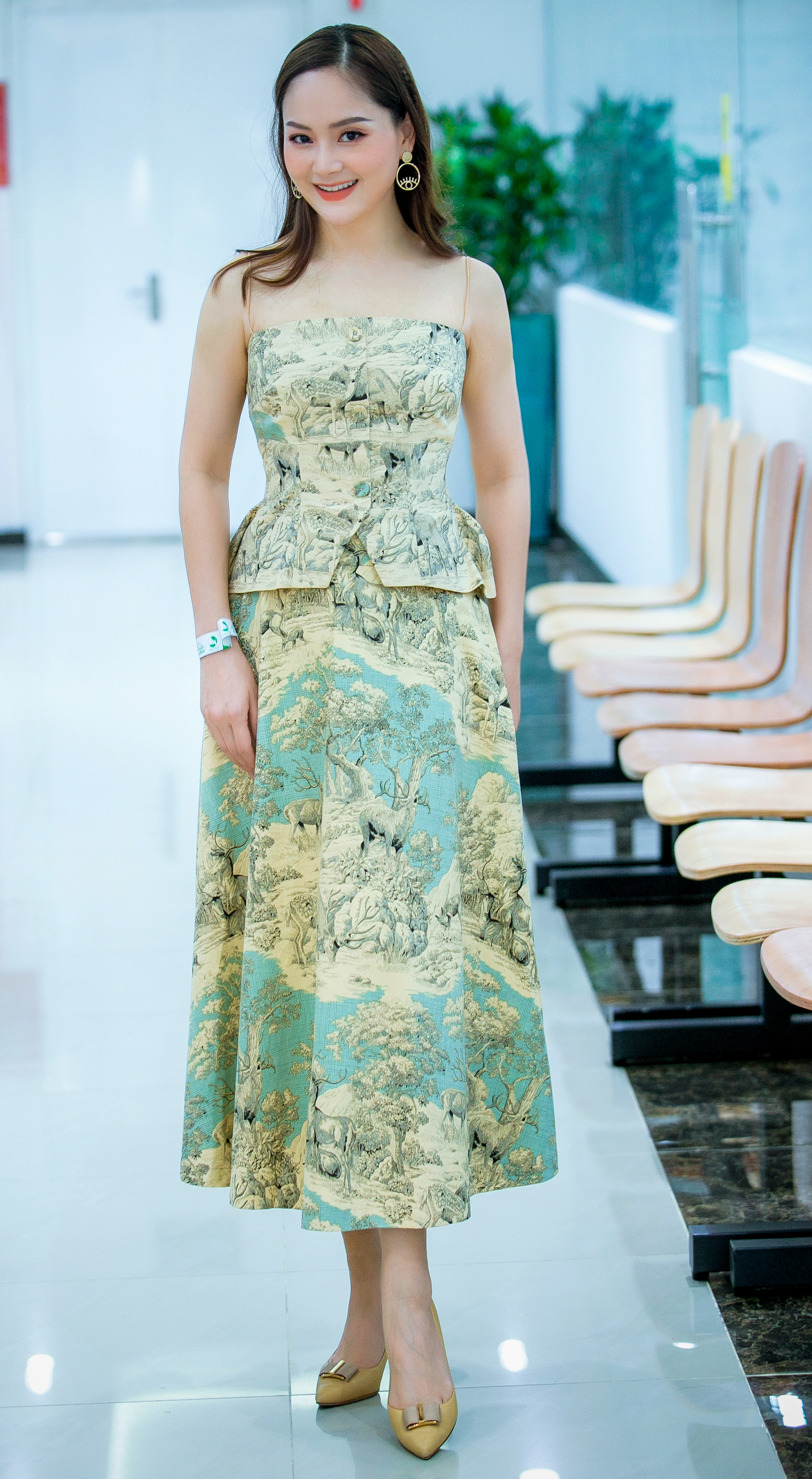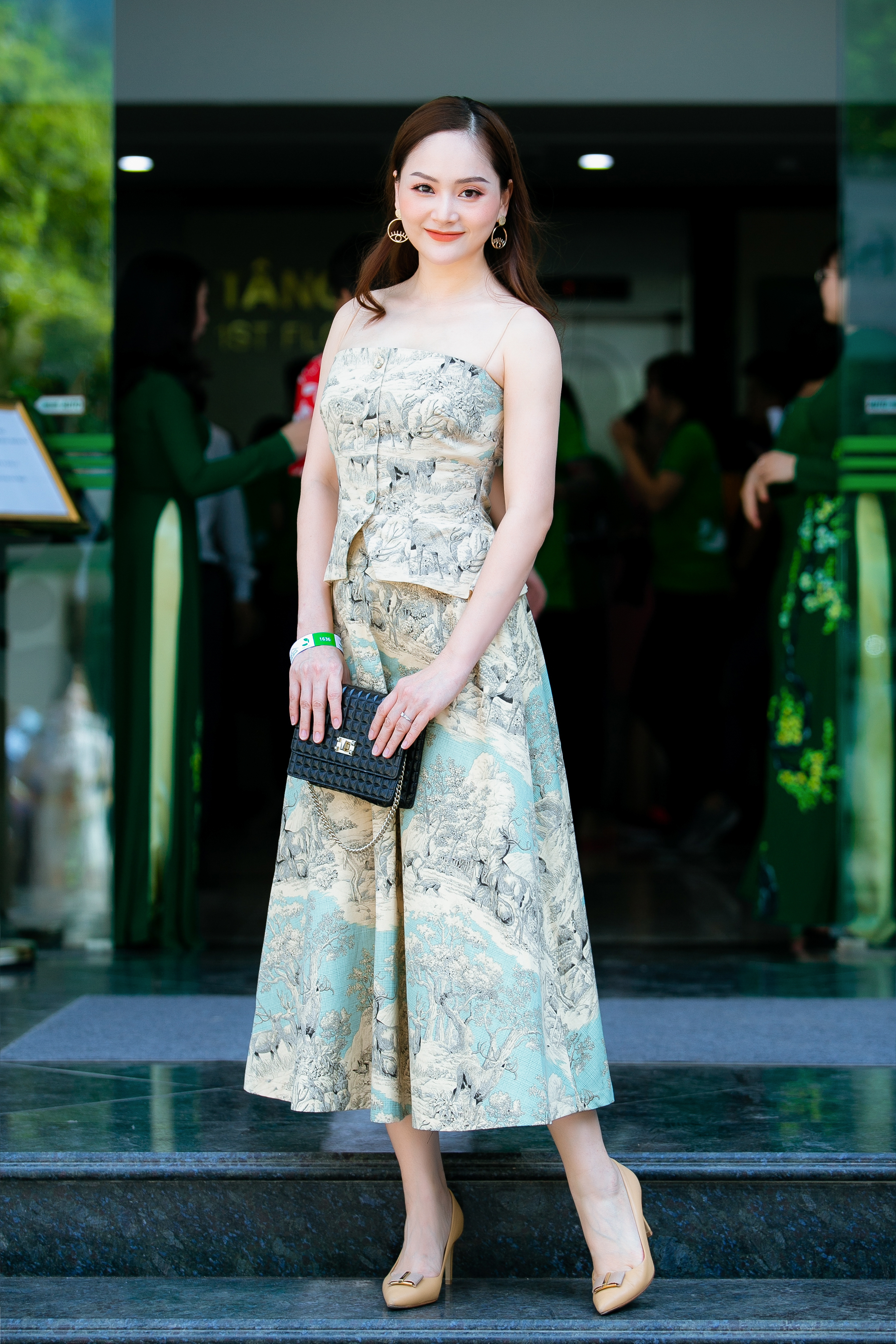 Nhà văn Lam Lam” diện đầm xanh hoa tiết hoa nền nã, khoe vai thon và khuôn ngực đầy đặn vô cùng cuốn hút.
