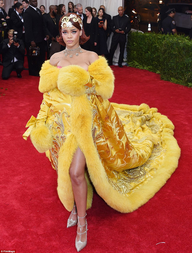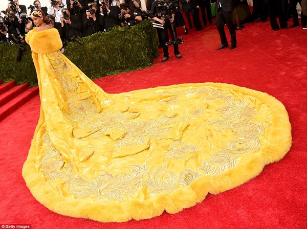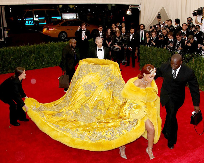 Rihanna cũng đã nhiều lần chặt chém tại sự kiện với loạt váy áo rực rỡ, hoành tráng. Trong số đó chắc chắn không thể bỏ qua màn hóa thân vương phi lộng lẫy này.