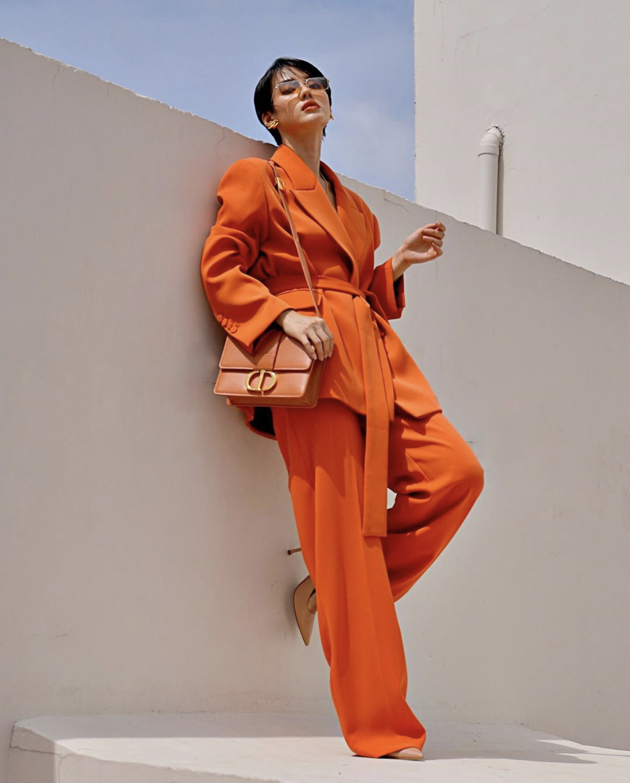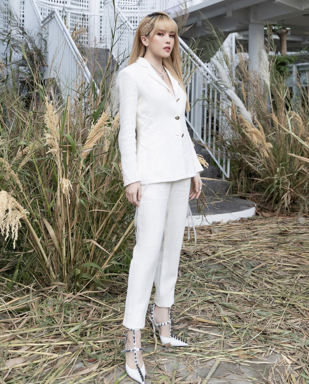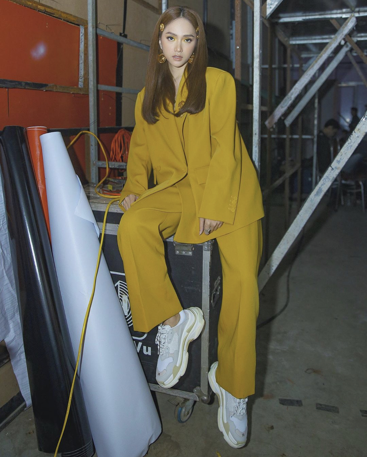 Hương Giang đầy cá tính trong bộ vest tông cùng tông tổng thể trang phục. Không phối cùng cao gót Hương Giang “chơi trội” hơn bằng phối cùng sneaker