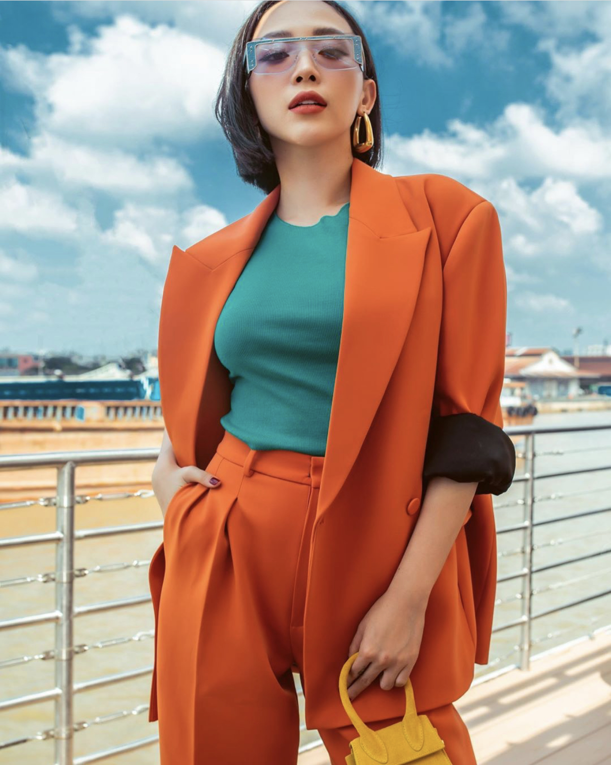 Chẳng hề diện vest đơn lẻ một mình mà còn đi đôi cặp với nhau. Tông xẹt tông, ai nấy đều có tính cách riêng. Vest nhưng vẫn giữ tí bánh bèo thì gọi tên Lệ Hằng và Quỳnh Anh Shyn, vest cá tính hết phần thiên hạ xin gọi tên Hương Giang! Còn vest chơi màu sắc xin gọi tên Tóc Tiên