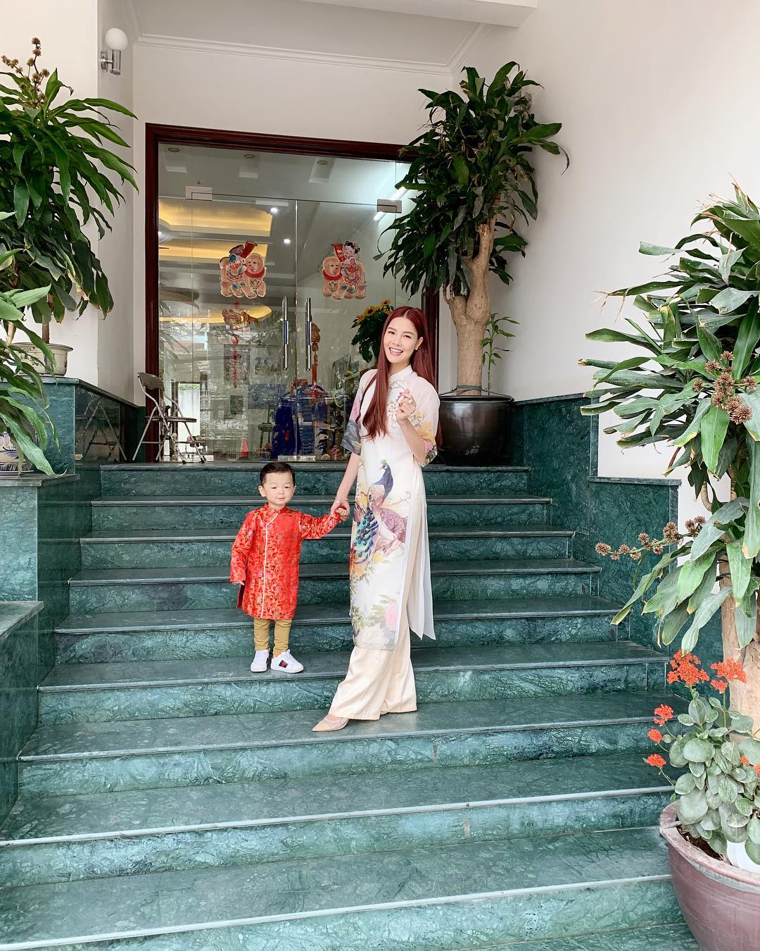 Kỳ Hân xúng xính áo dài, vui tươi dắt con trai bát phố.