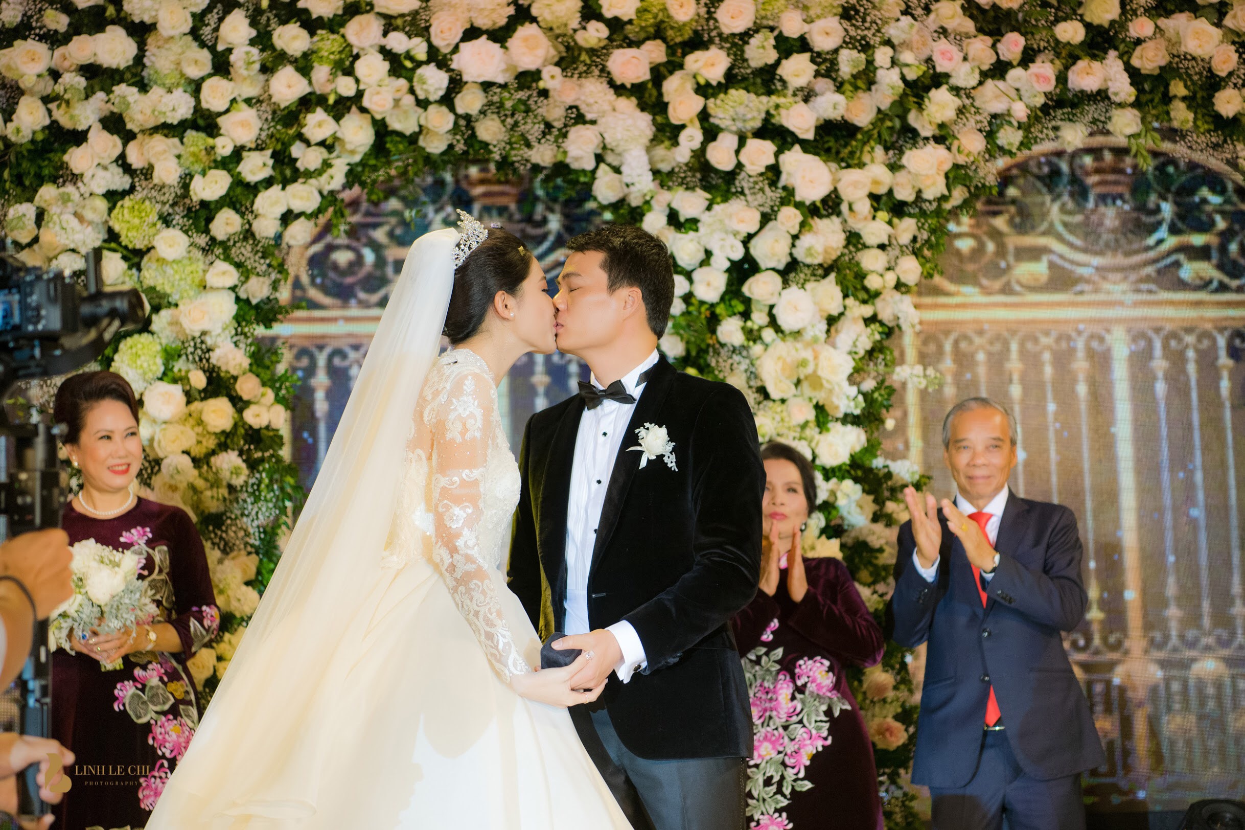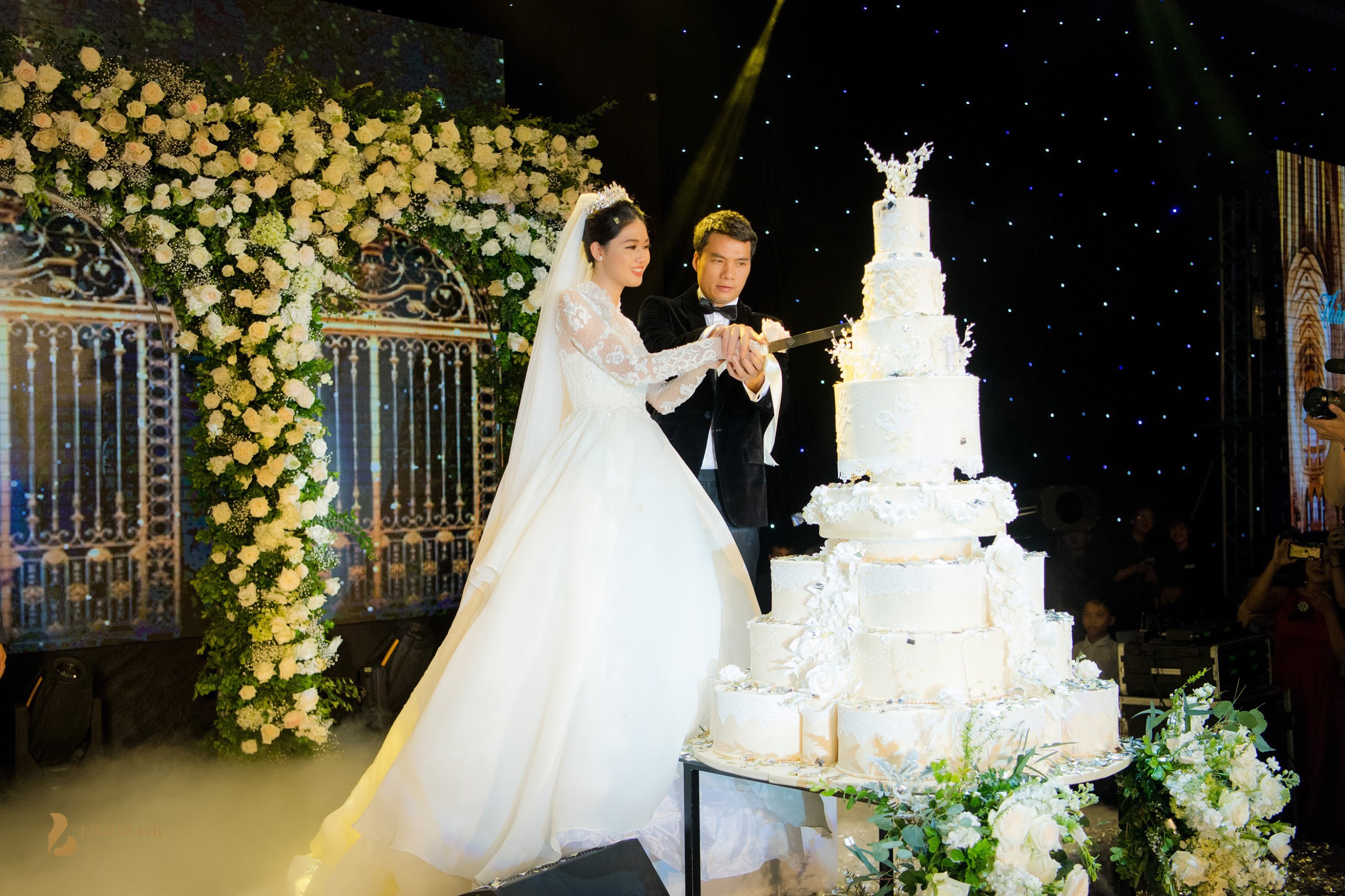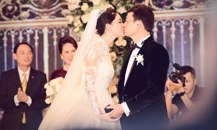 Không những gây chú ý bởi phong cách thiết kế ấn tượng, dàn khách mời là những người nổi tiếng cũng là một trong những điểm chú ý của đám cưới thế kỷ này. Và giây phút thiêng liên nhất - Thanh Tú khoác lên người chiếc váy cưới trắng tinh khôi cầm tay chú rể và thề hứa trọng đời bên nhau chính là lúc thời gian ngưng lại.